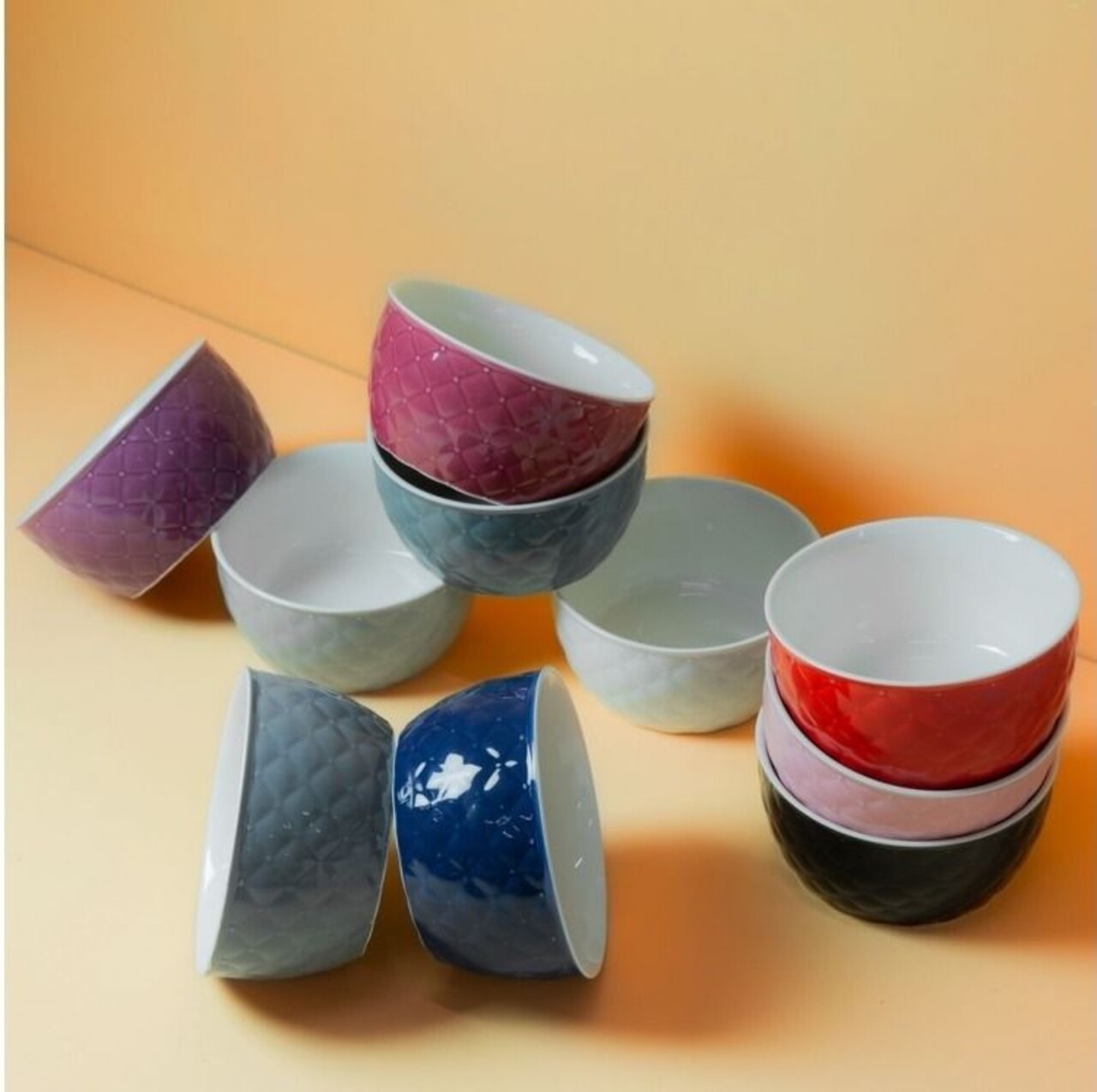 Boluri din portelan veritabil cu model imprimat in reliev. Diametru de 13.5cm, disponibile in mai multe culori, pentru a se potrivi perfect cu bucataria dumneavoastra.