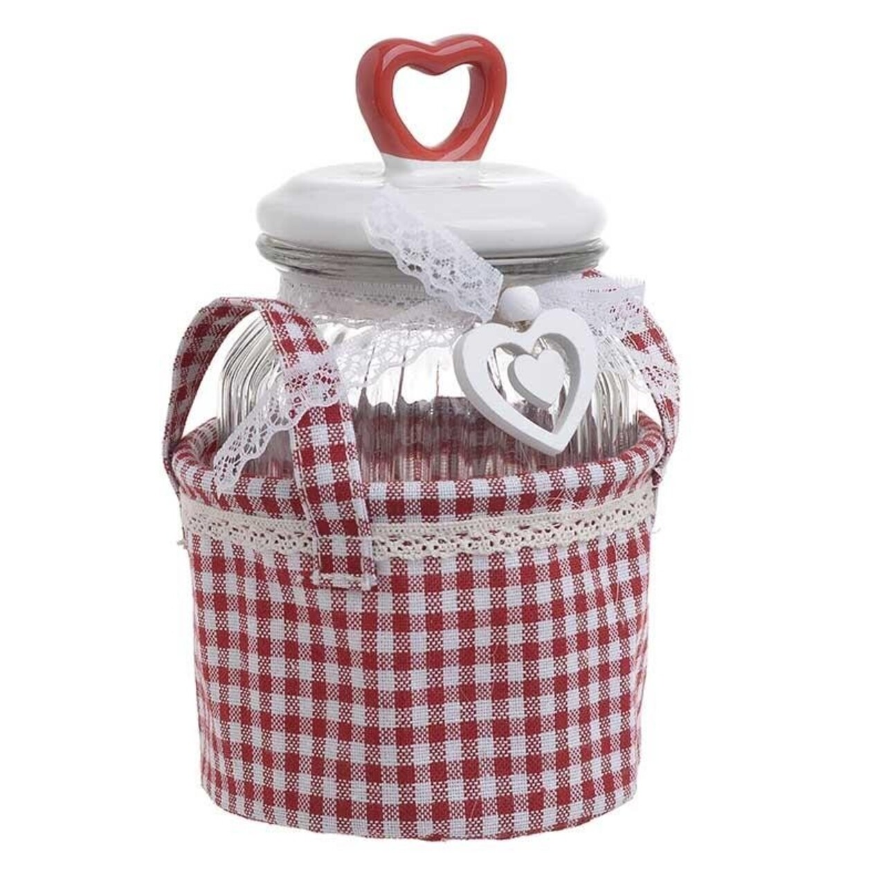 Borcan cu capac si cos, InArt, 12 x 21 cm, sticla/bumbac, alb/rosu