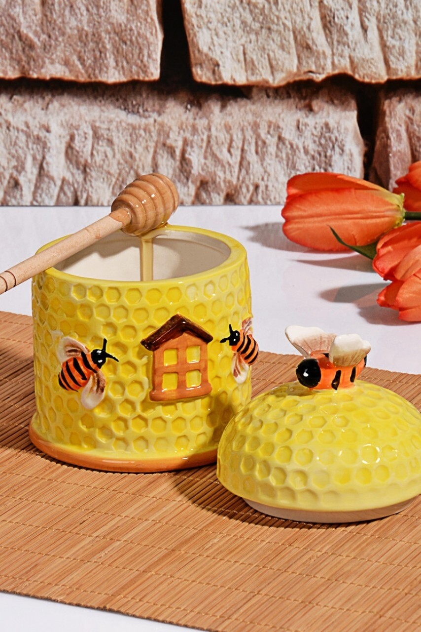 Borcan cu capac si lingura pentru miere BAL-507, Kosova, Ø14 cm, ceramica, galben/portocaliu/negru