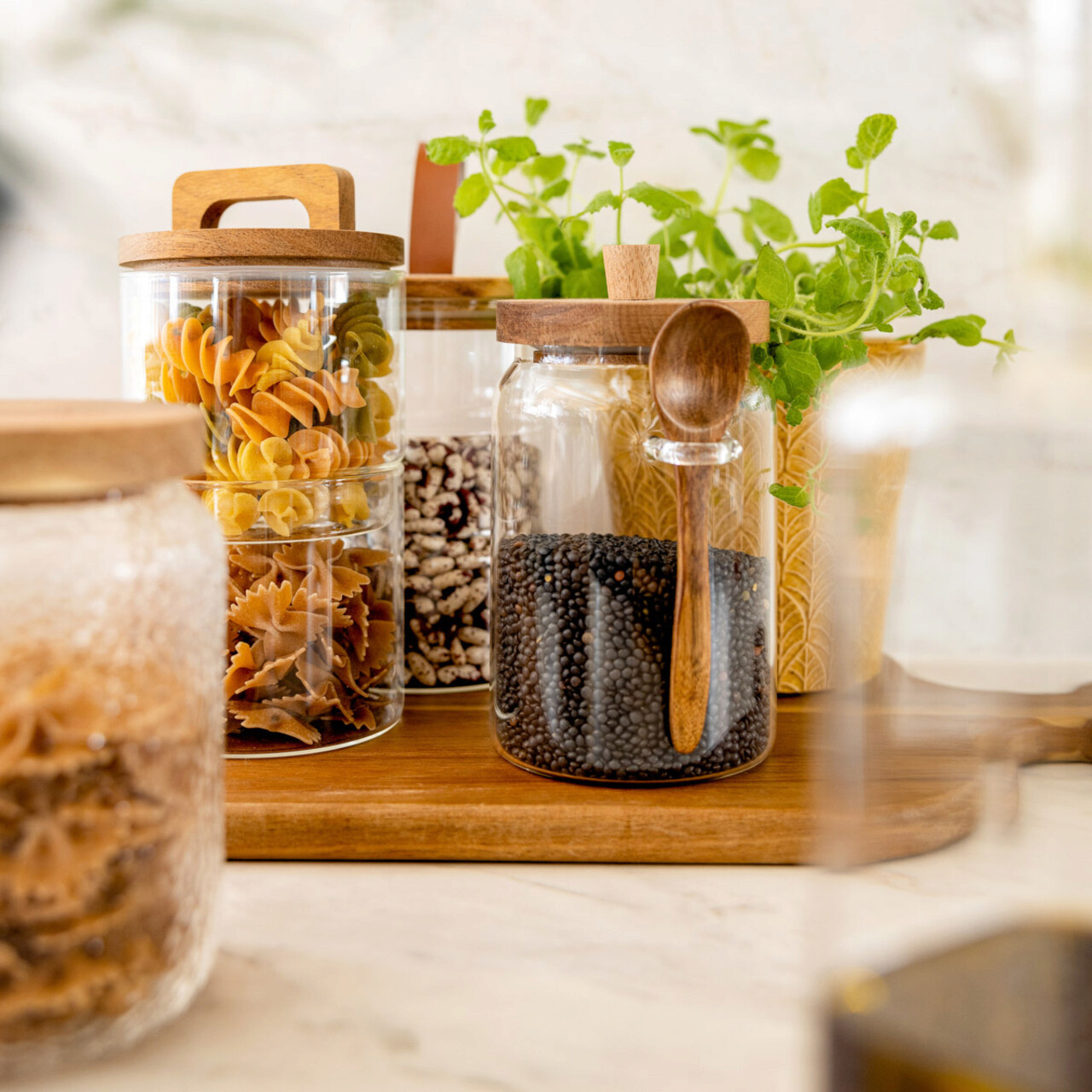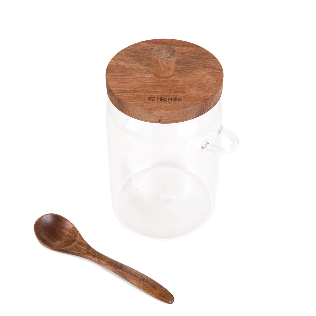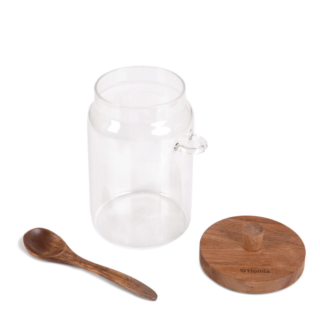 Borcan pentru depozitare cu capac si lingura Carlos, Homla, 900 ml, sticla/lemn, transparent/natur