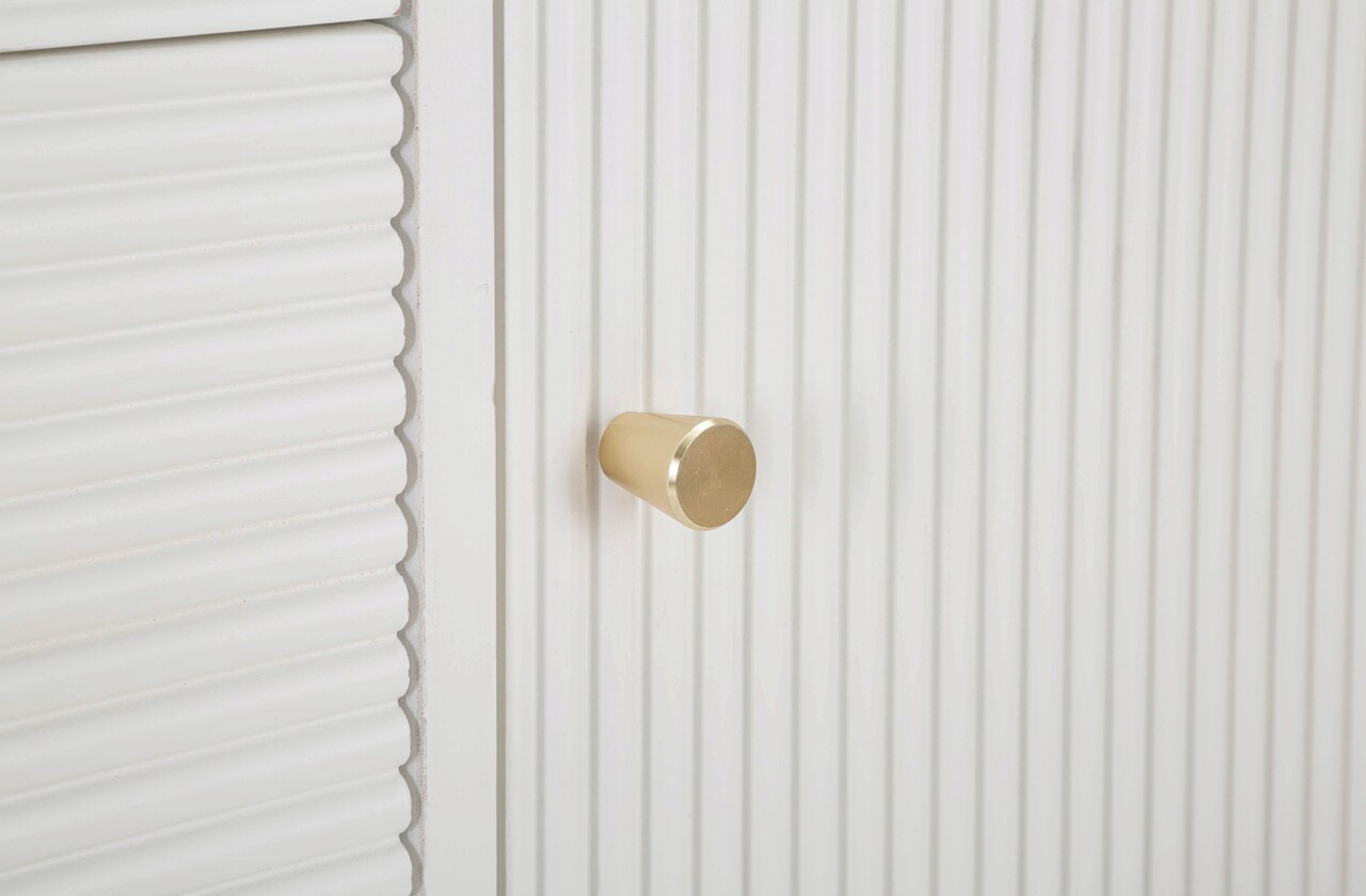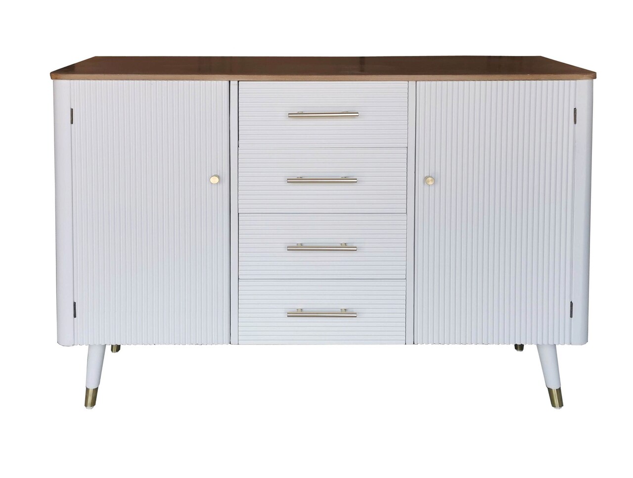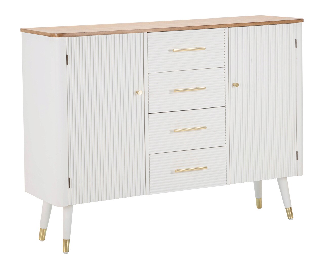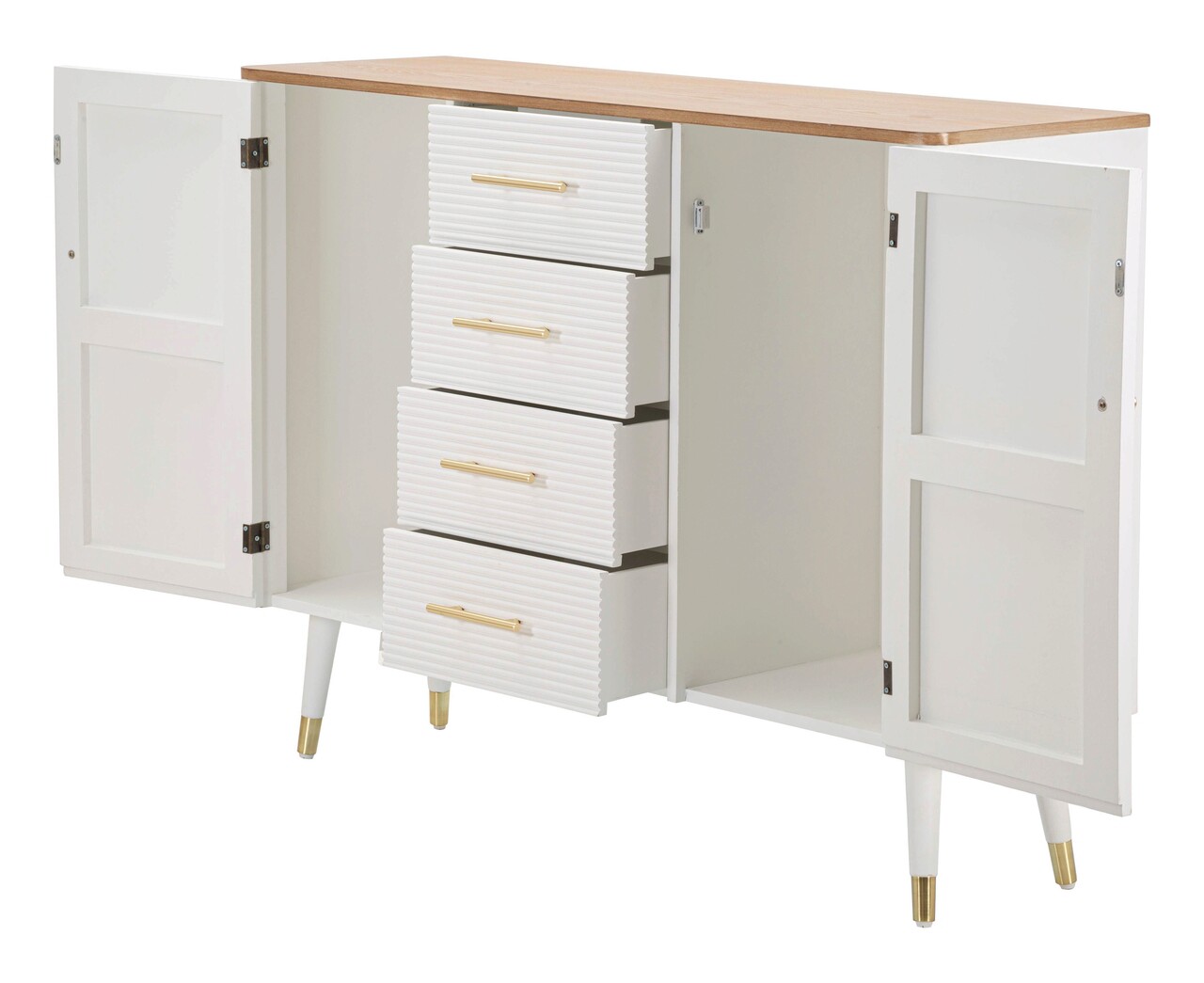 Bufet din lemn alb, cu linii simple si elegante. Echipat cu 2 usi si 4 sertare si blat din lemn maro. Manerele si picioarele din metal auriu dau o nota de eleganta. Dimensiuni sertar: 35 x 28 x 15 cm. Dimensiuni interioare compartiment cu usa: 38 x 34 x 67 cm. Inaltime picioare: 21 cm. Compozitie material: lemn de frasin, lemn de pin, MDF, fier