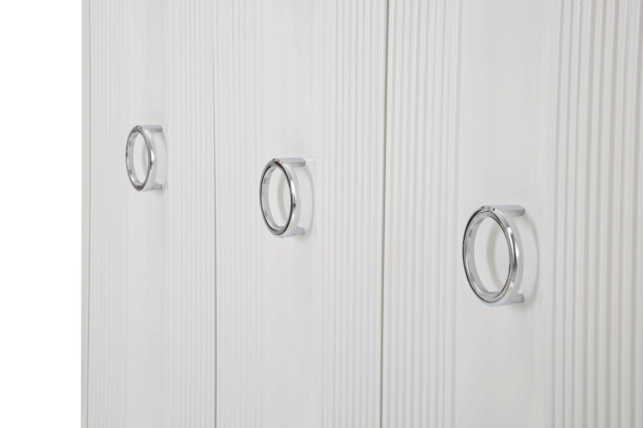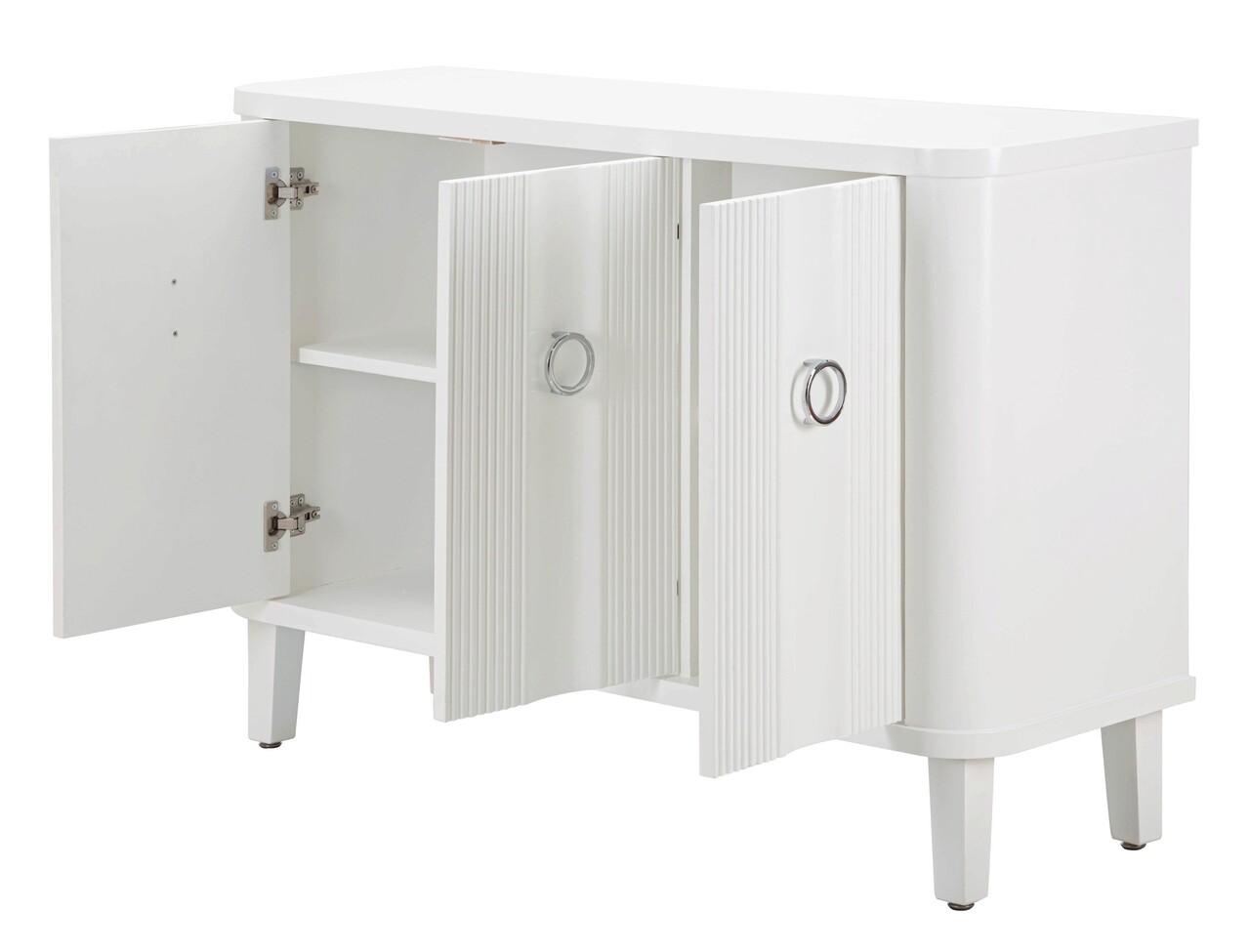 Bufet din lemn alb cu 3 usi, cu manopera simpla si linii elegante. Dimensiuni interiore compatiment cu usa: 66 x 39 x 29 cm. Inaltime picioare: 17 cm. Compozitie material: lemn de brad, MDF, metal