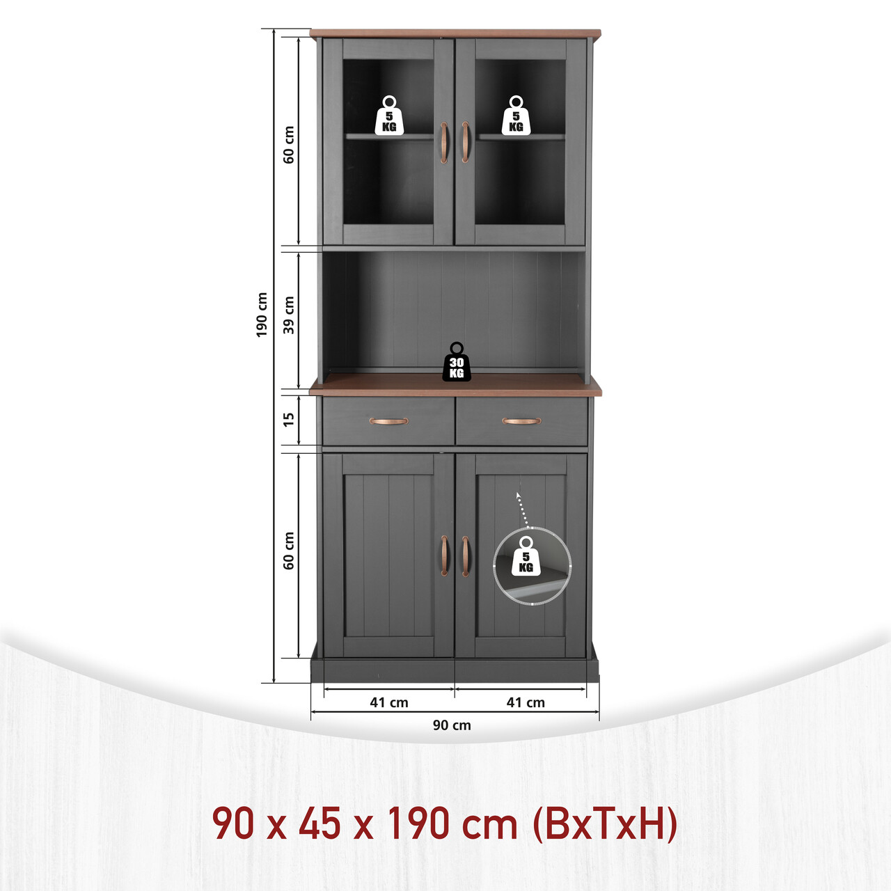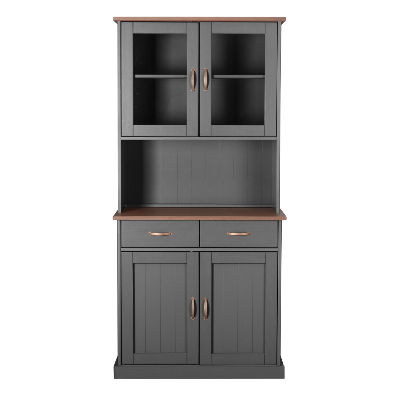 Bufetul LUZERNA va permite sa va organizati eficient bucataria sau sufrageria. Practic si functional, ofera spatiu amplu de depozitare pentru vase sau alte obiecte la alegere, datorita celor doua sertare si rafturilor din spatele a doua usi mari. Doua usi de sticla si o nisa centrala completeaza piesa. Nisa centrala poate gazdui, de asemenea, o vaza, cateva bibelouri sau o tava de valet. Manerele metalice de culoarea cuprului adauga o nota de originalitate bufetului. Acest bufet va completa perfect decorul bucatariei sau sufrageriei dumneavoastra. Certificatul FSC confirma ca aceasta piesa de mobilier a fost fabricata in mod sustenabil si ecologic.