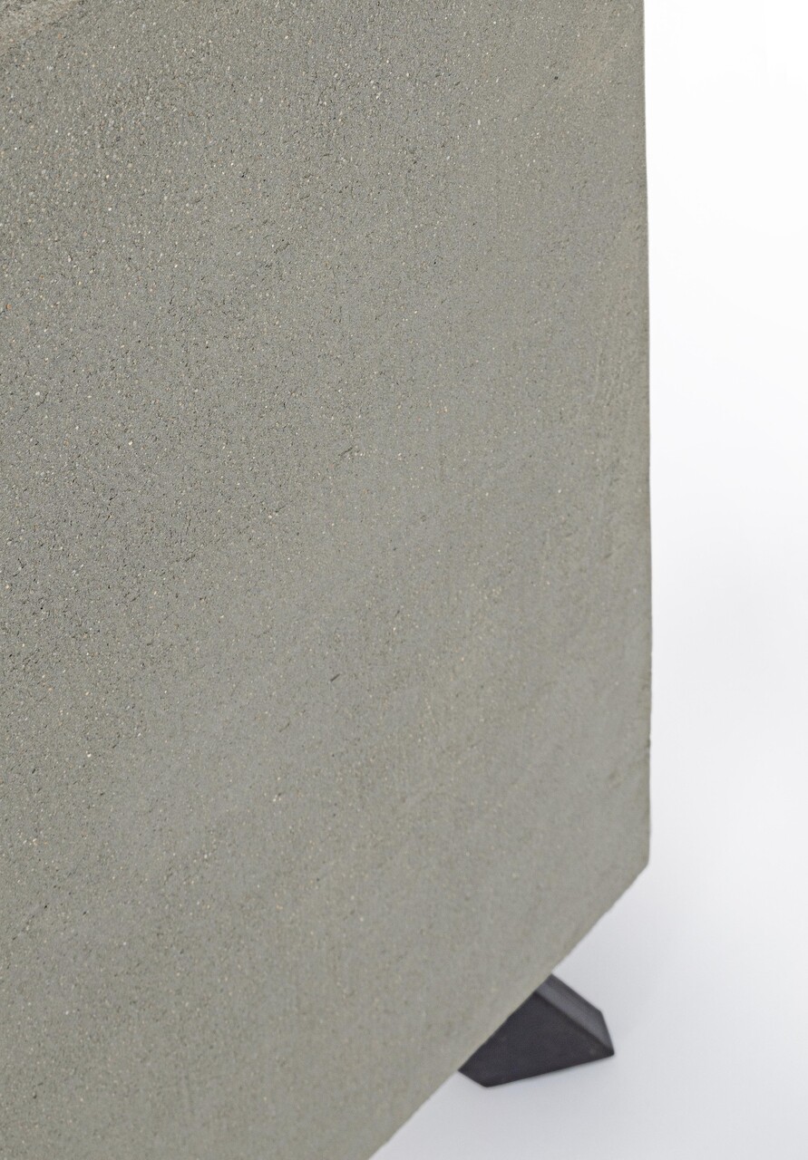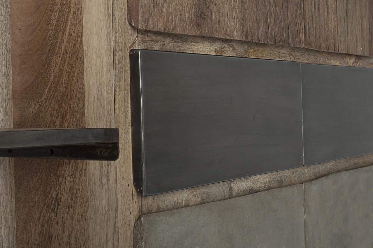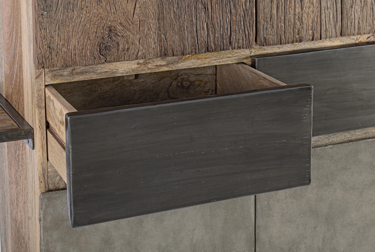 Partea frontala a usilor si a sertarelor este din lemn reciclat, fier sau finisaj din fibrociment.
