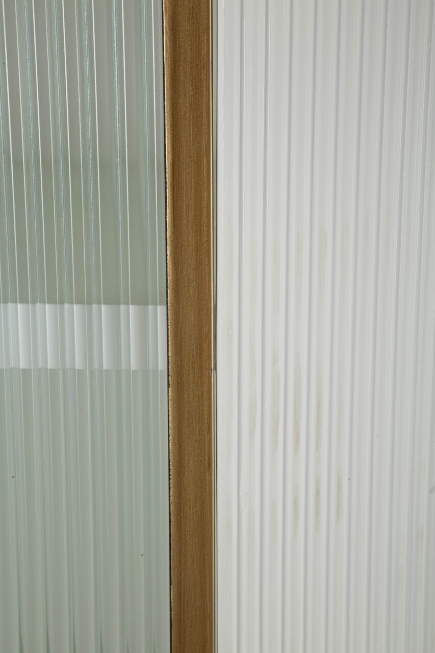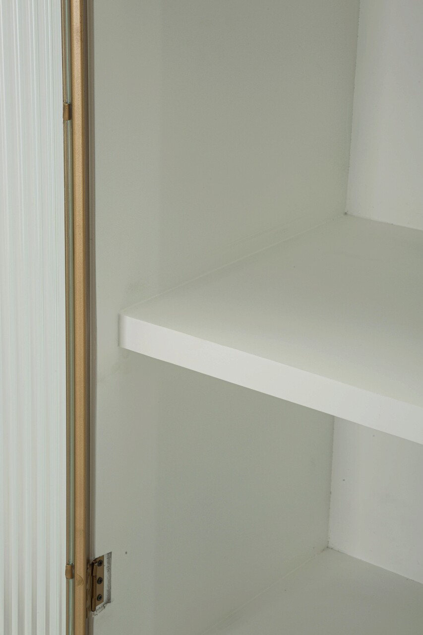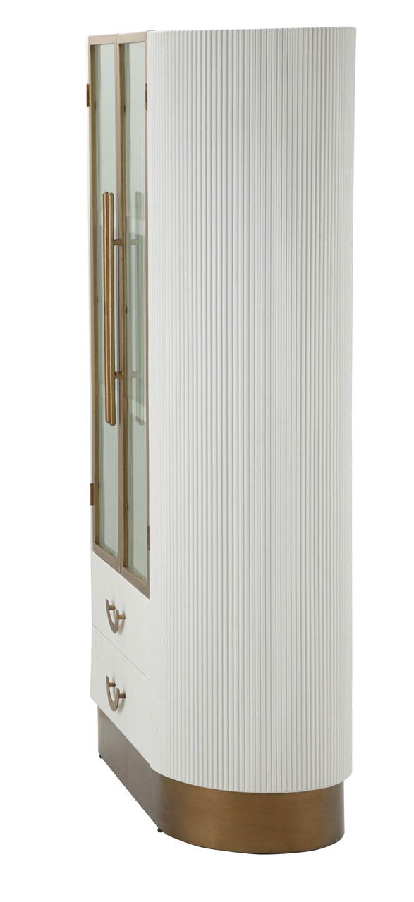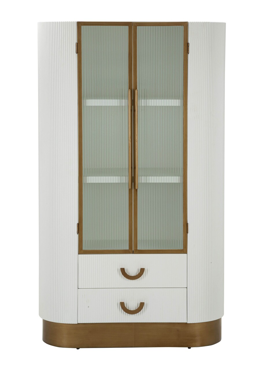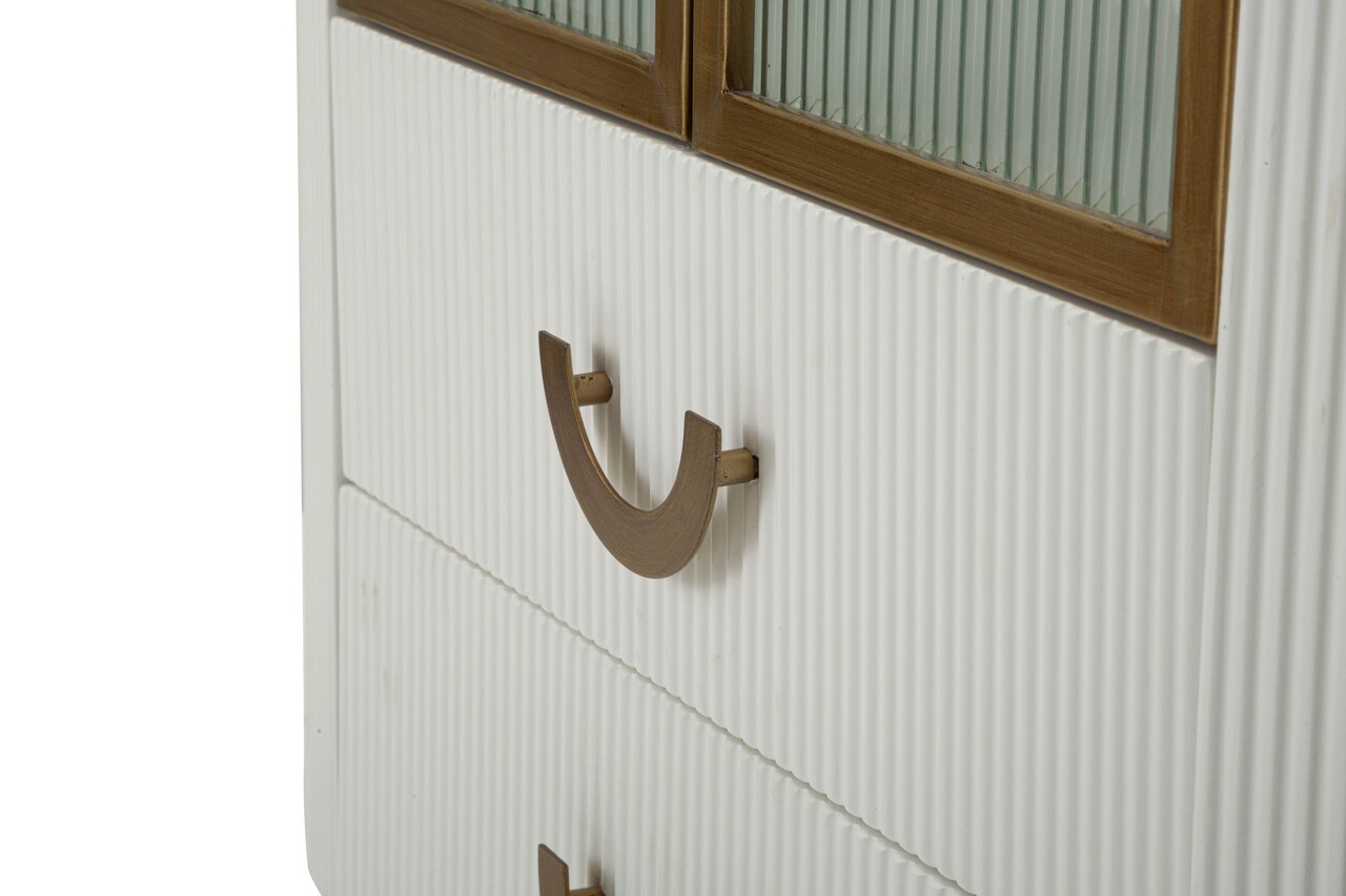 Vitrina din lemn alb cu insertii din lemn maro cu design rotunjit. Decorat fin cu linii in relief. Complet cu 2 usi si 2 sertare. In interior se afla 3 rafturi. Dimensiuni interioare sertar: 49.5 x 28 x 10 cm.