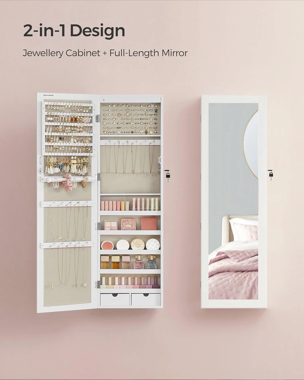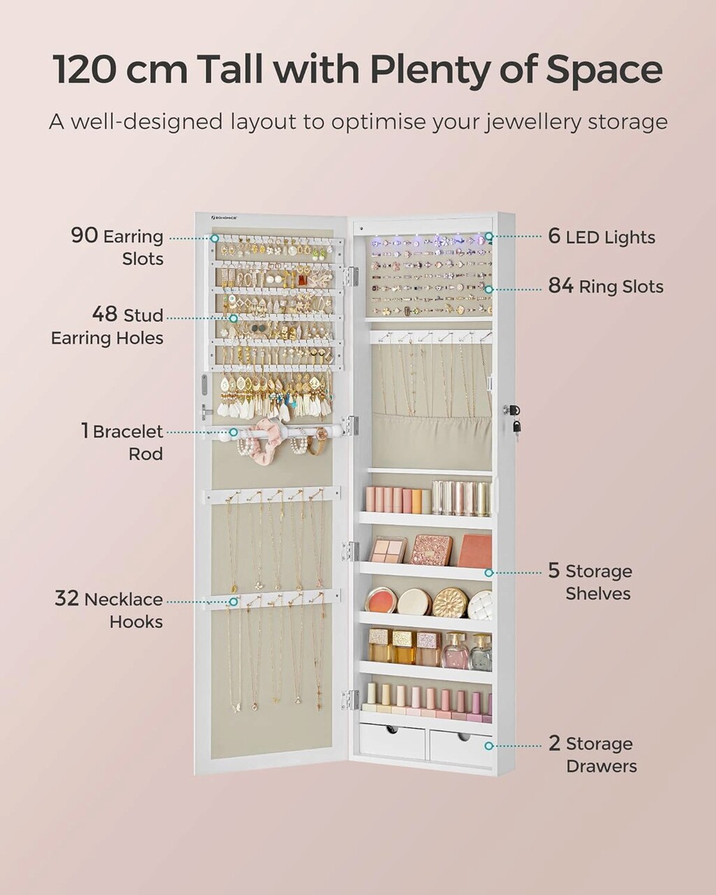 Toate bijuteriile intr-un singur loc La sfarsitul unei zile lungi, scoateti-va inelele, cerceii si colierele si puneti-le inapoi in interiorul acestui dulap de bijuterii-84 de locuri pentru inele, 90 de fante pentru cercei, 48 de orificii pentru cercei, 32 de carlige pentru coliere, 5 rafturi, 2 sertare si 1 tija pentru bratari, toate intr-un singur loc.