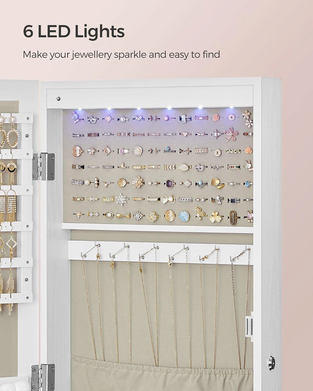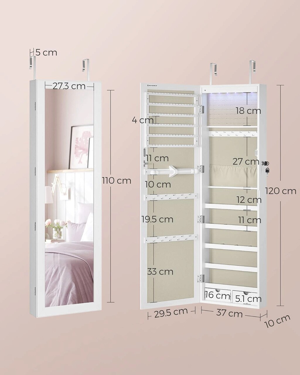Cabinet pentru bijuterii cu LED-uri, oglinda si fixare usa/perete Songmics, 36.7 x 10 x 120 cm, MDF/catifea/sticla, alb