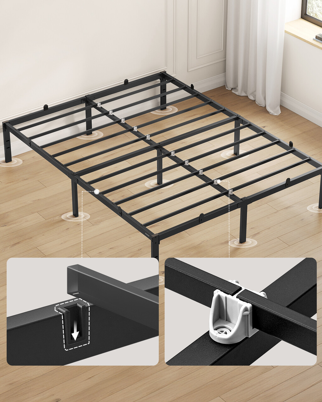 Orificiile pregaurite permit montarea unei tablii de pat (nu este inclusa). Sistemele de fixare impiedica alunecarea saltelei, iar protectiile pentru podea reduc zgomotul si previn zgarierea.