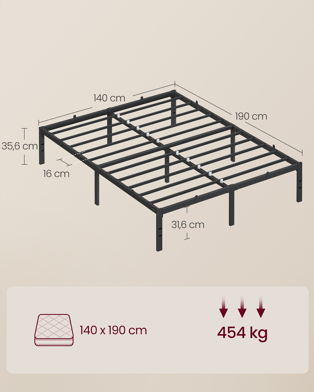 Cadru de pat dublu, Vasagle, 140x190 cm, otel, negru ink