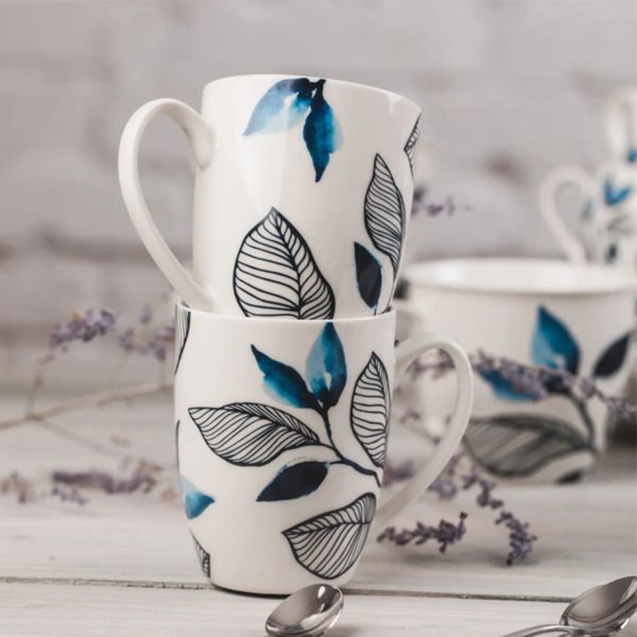 Cana Blue Flower de 370 ml este fabricata din portelan New Bone China de inalta calitate. Este decorat cu un motiv floral in nuante de albastru. Prezentat in scene cu doua frunze, strapuns si acuarela, ofera o nuanta vizuala si artistica. Se pot introduce in cuptorul cu microunde, si se pot curata cu usurinta in masina de spalat vase.