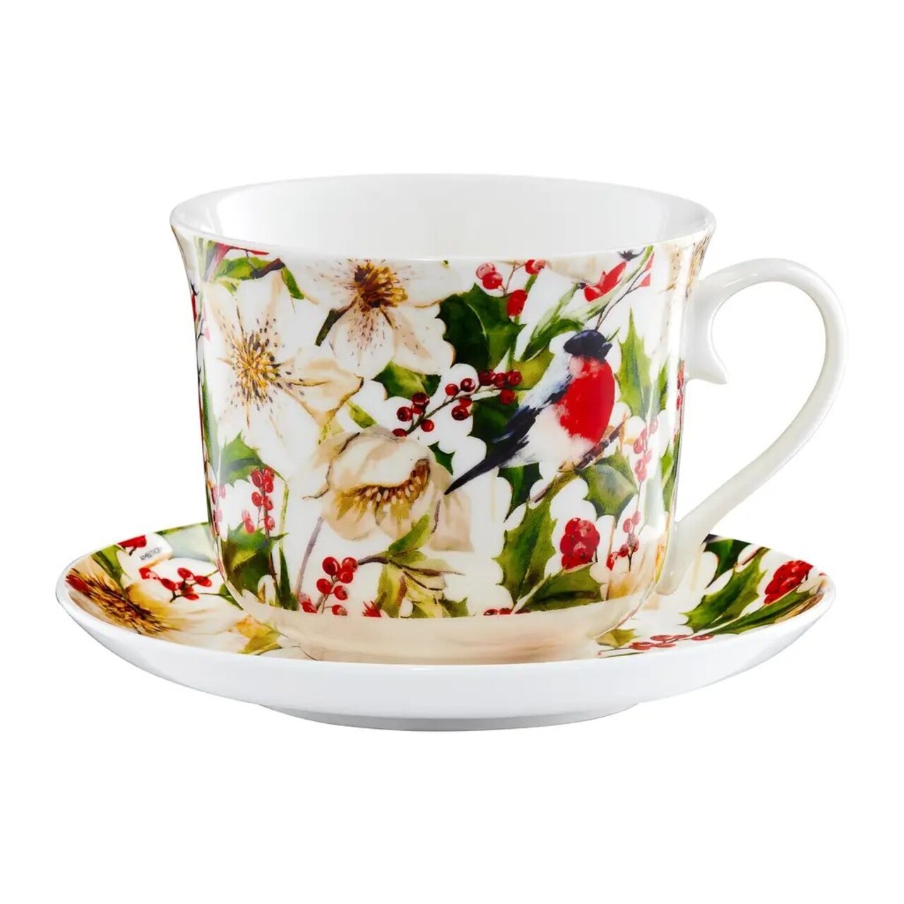 Cana BOTANIC cu farfurie este realizata din portelan New Bone China. Florile, frunzele si o pasare fac o combinatie sofisticata si eleganta. O idee grozava de cadou. Are o capacitate mare de 450 ml.