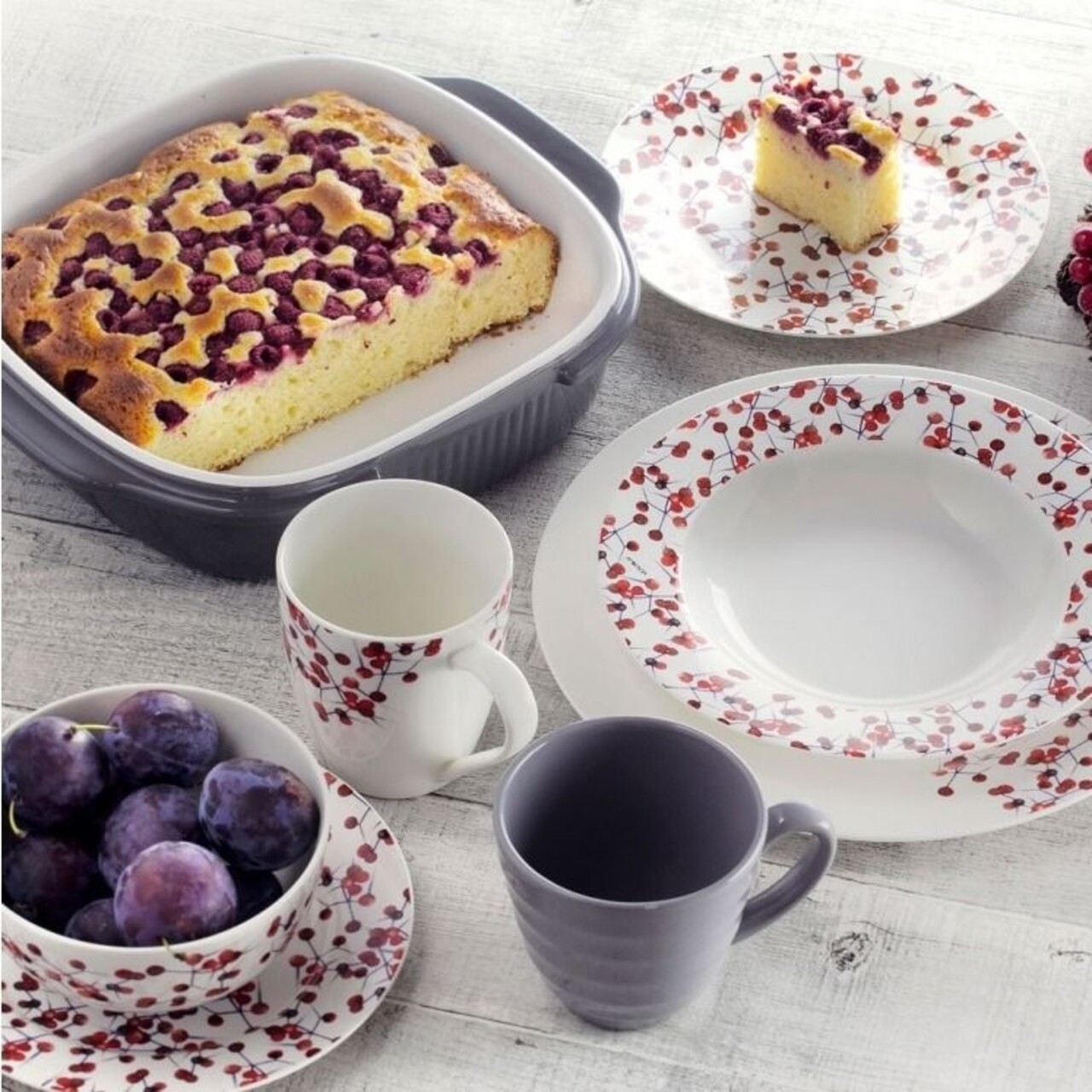 Colectia Holly este produsa din portelan de foarte buna calitate, fructele de padure decorative aducandu-i un plus de eleganta. Datorita formei si designului este potrivita atat pentru bucatariile clasice cat si pentru cele moderne. Vasele pot fi spalate cu usurinta in masina de spalat vase.