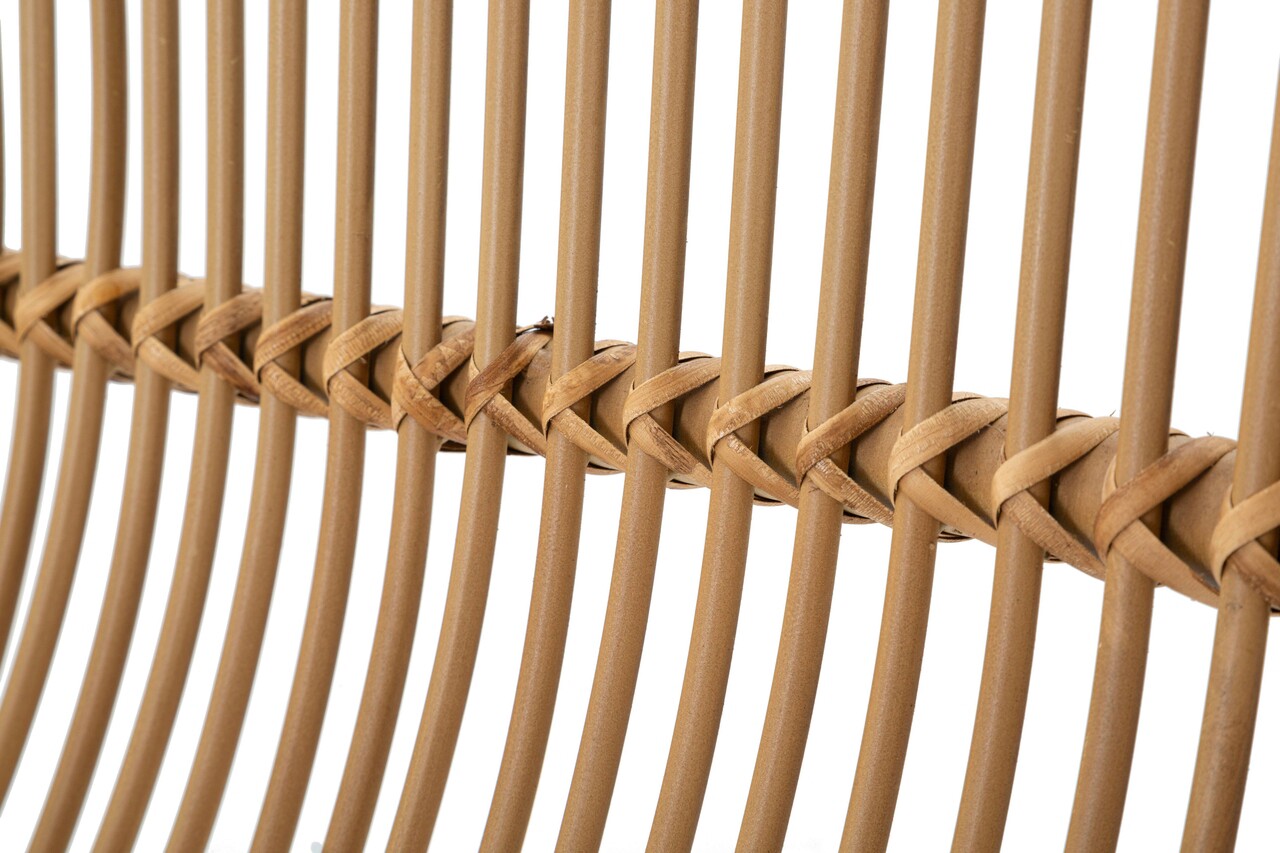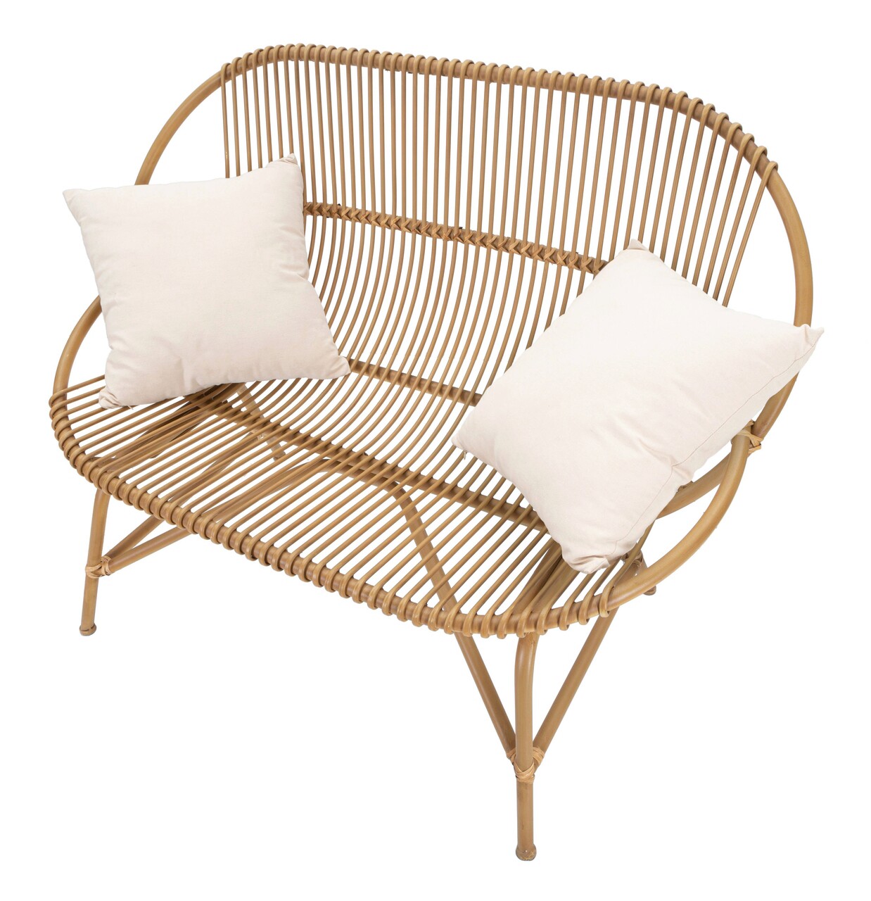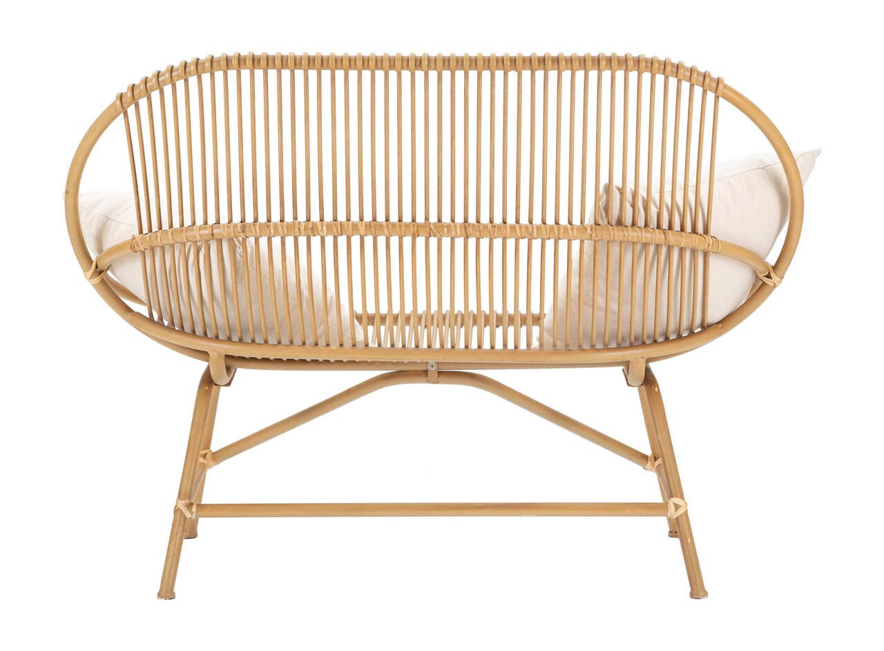 Canapea cu 2 locuri din metal cu detalii din ratan, cu un design rotunjit si captivant. Este prevazuta cu 2 perne din tesatura alba.