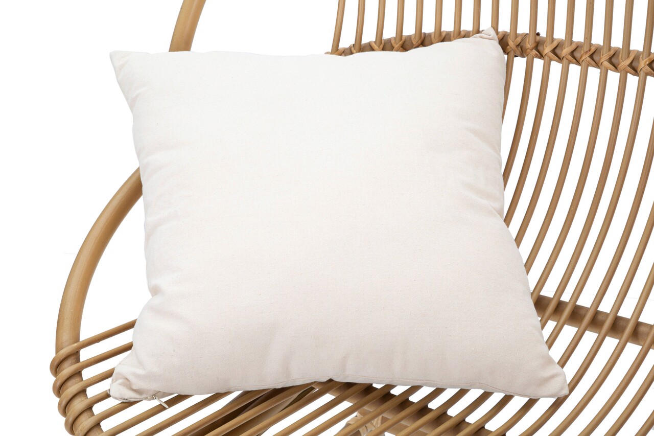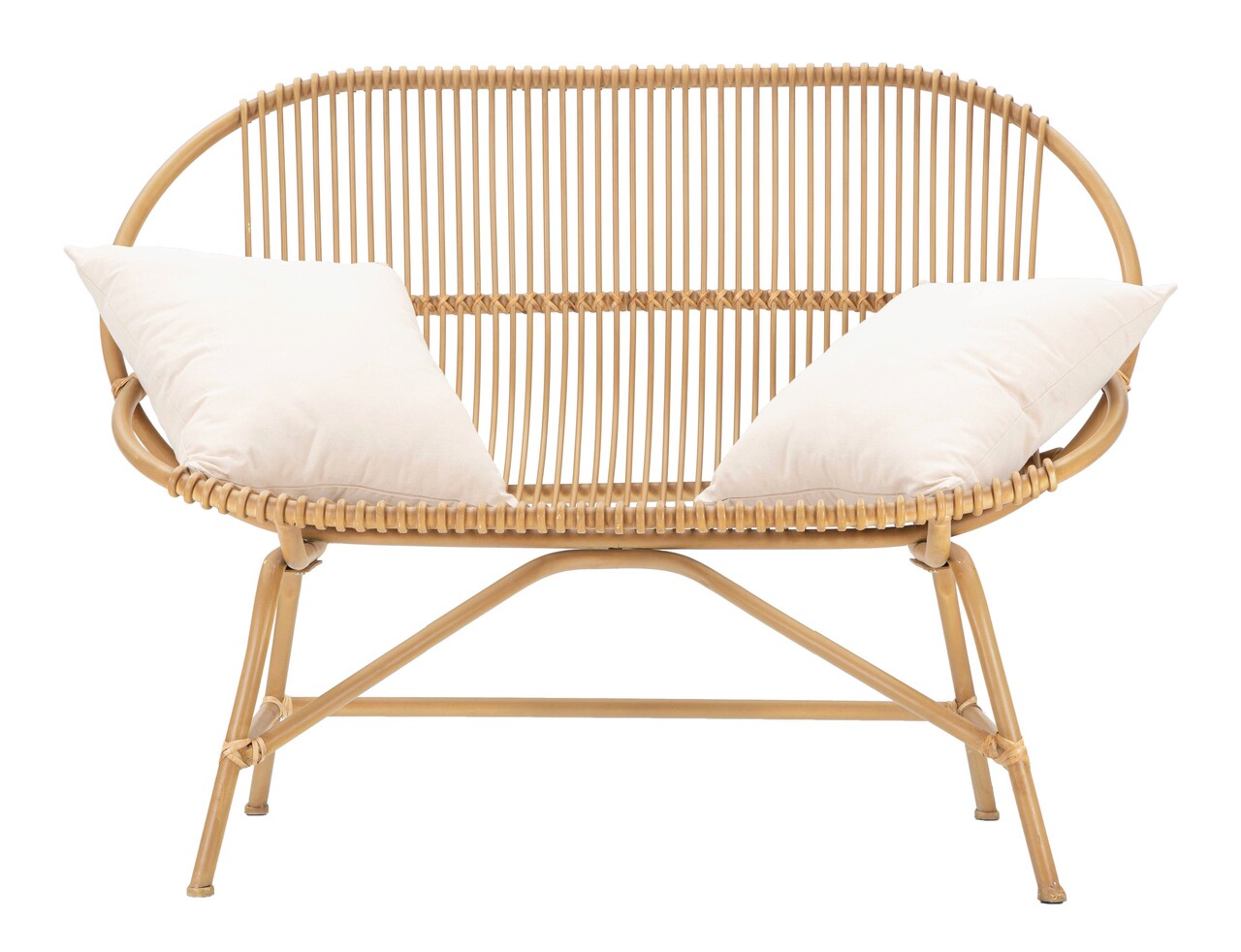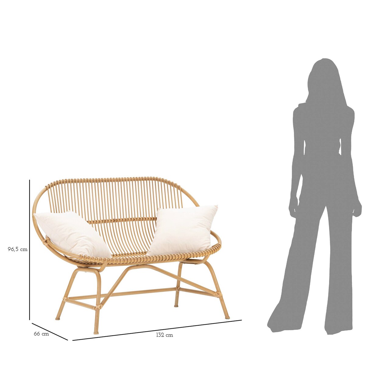 Canapea cu 2 locuri din metal cu detalii din ratan, cu un design rotunjit si captivant. Este prevazuta cu 2 perne din tesatura alba.
