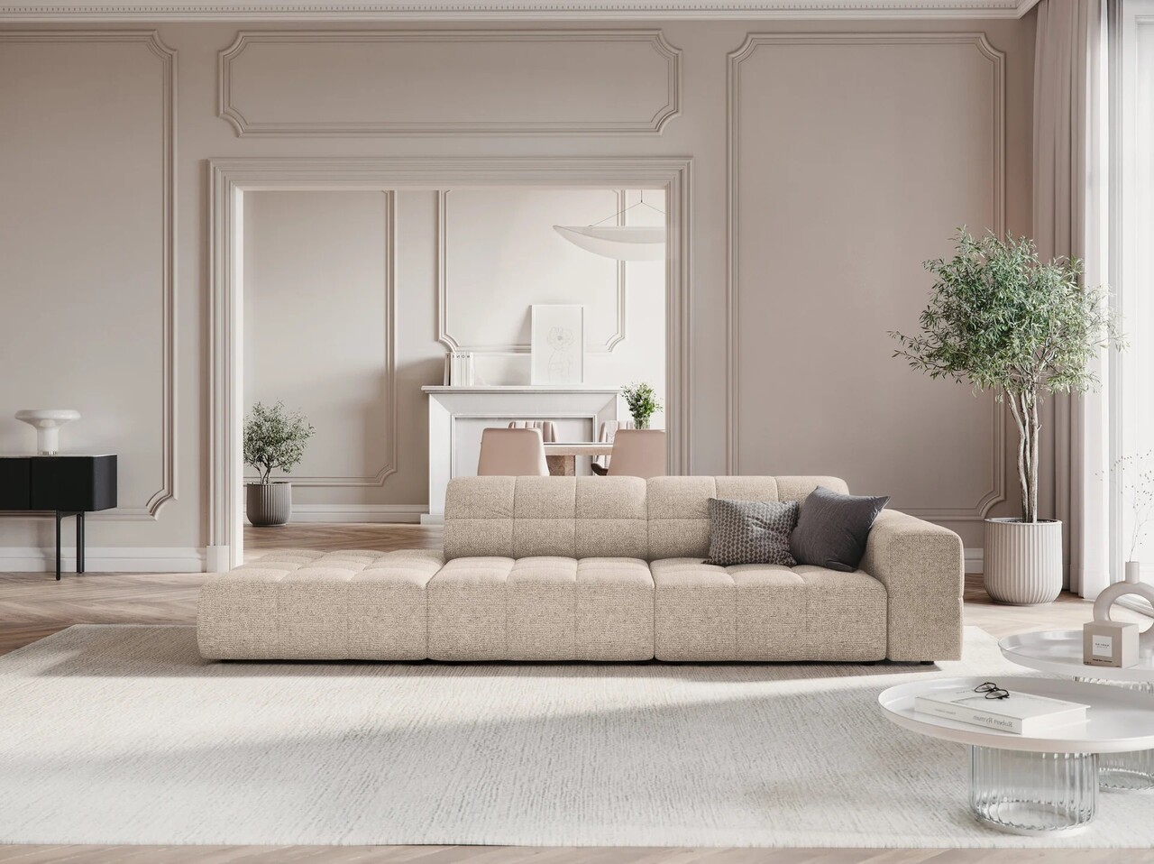 Sezutul canapelei este proiectat sa se incline usor spre spatar pentru un confort sporit, in timp ce otomanul are aceeasi inaltime pe intreaga sa suprafata. Diferenta de inaltime este vizibila doar acolo unde cele doua module se conecteaza