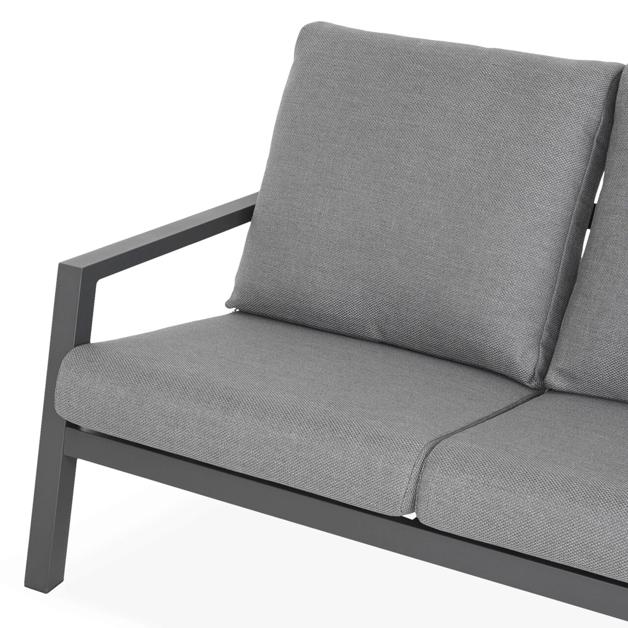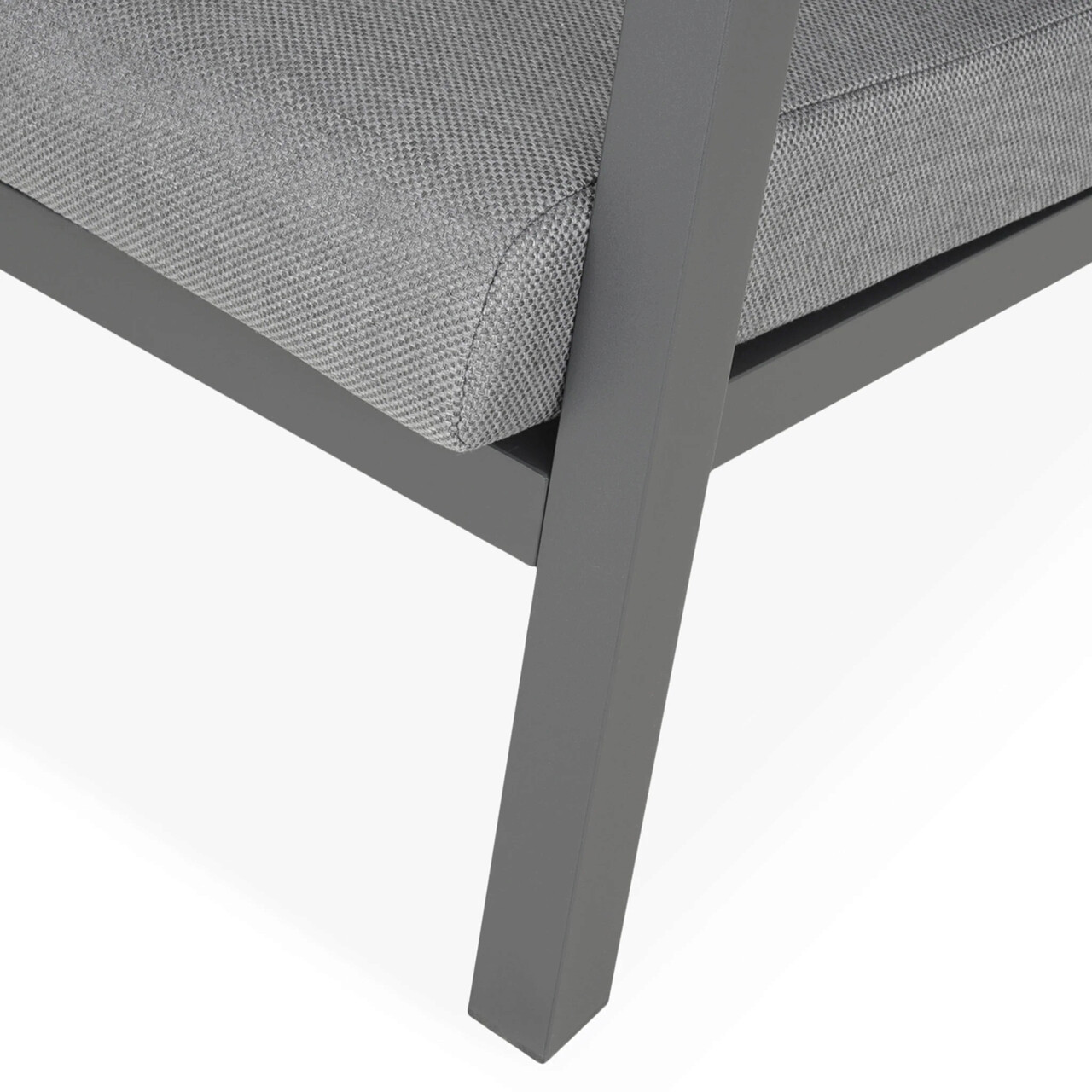 Realizat din structura de aluminiu vopsita in camp electrostatic . Include perne din tesatura Olefin cu protectie impotriva umezelii si a decolorarii. Husele pernelor sunt prevazut cu fermoar pentru a fi mai usor de indepartat si curatat.
