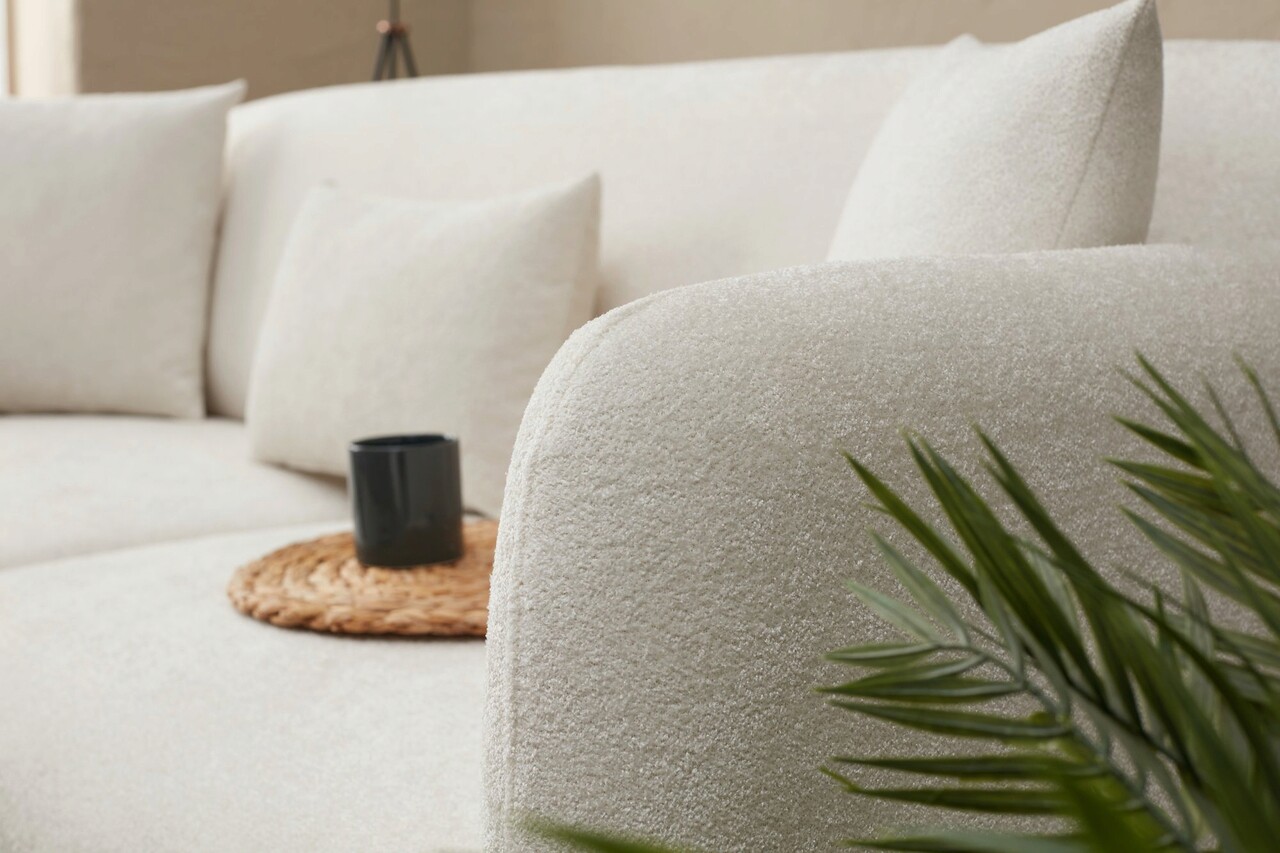 Canapeaua 3 locuri Simena este fabricata cu grija cu un cadru robust din lemn de fag pentru durabilitate si longevitate. Tesatura din 100% poliester boucle nu numai ca este usor de curatat, dar adauga si o nota de lux spatiului dvs. de locuit. Picioarele metalice ofera stabilitate si o estetica moderna, in timp ce spuma cu densitate 28 dns asigura un confort optim al sezutului.
