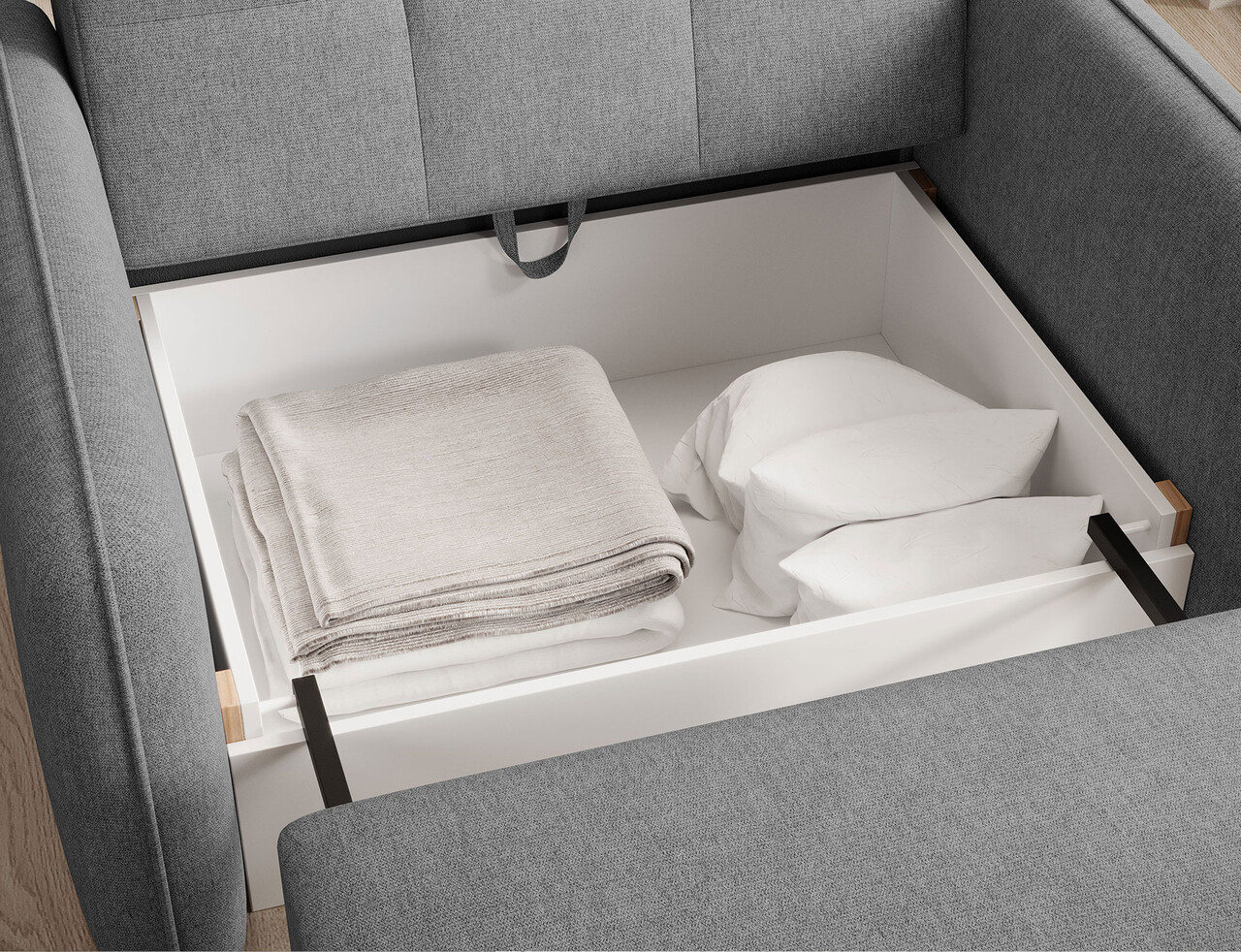 Unul dintre avantajele sale principale este functia de pat: printr-un mecanism simplu de extindere, canapeaua Laine se transforma rapid intr-un pat confortabil, fiind solutia perfecta pentru oaspeti neasteptati sau pentru locuintele cu spatiu limitat.