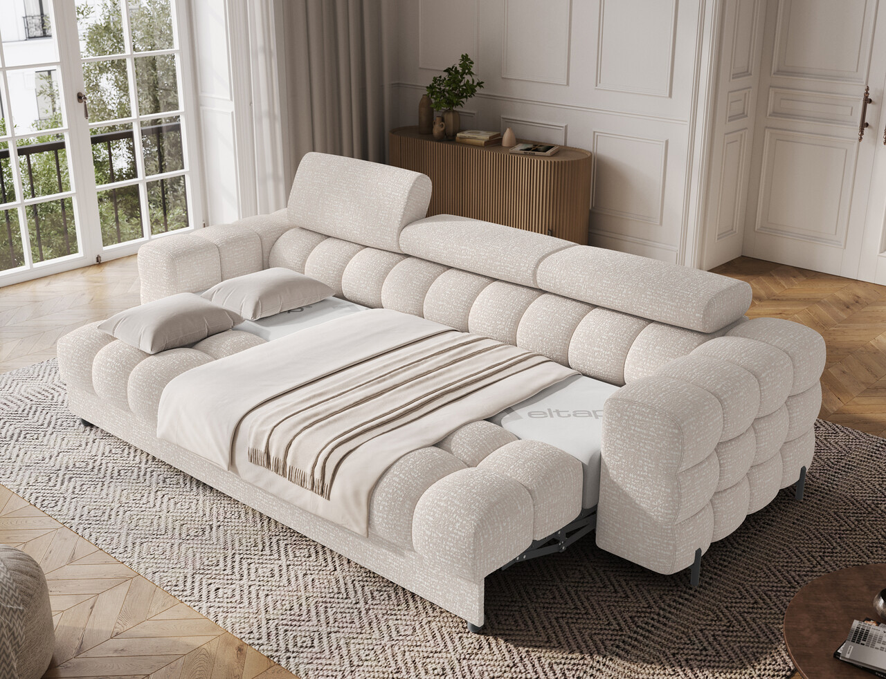 Canapea extensibila 3 locuri ELTAP, Festello, 260x100x96 cm, lemn/poliester, bej