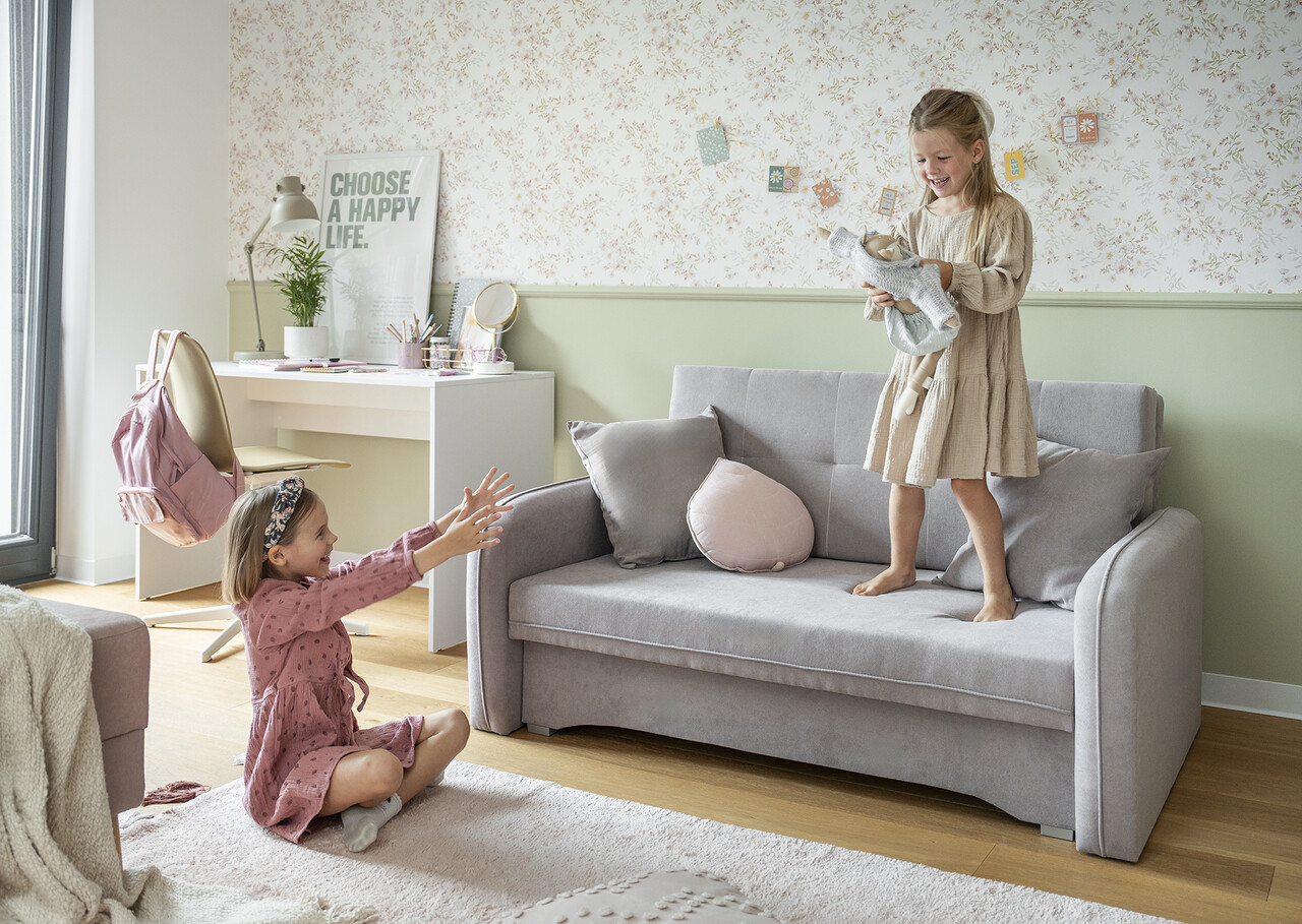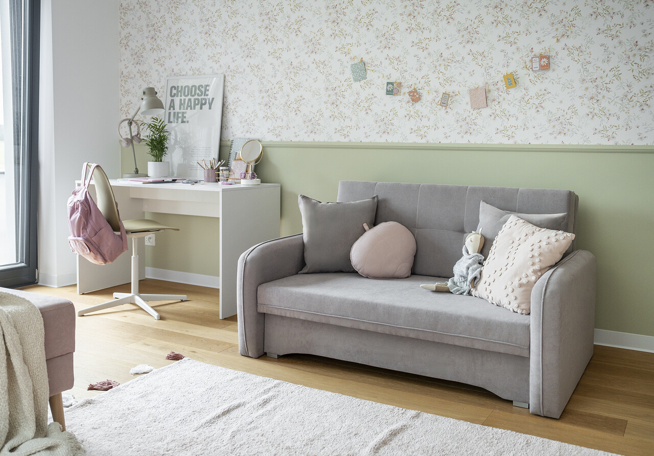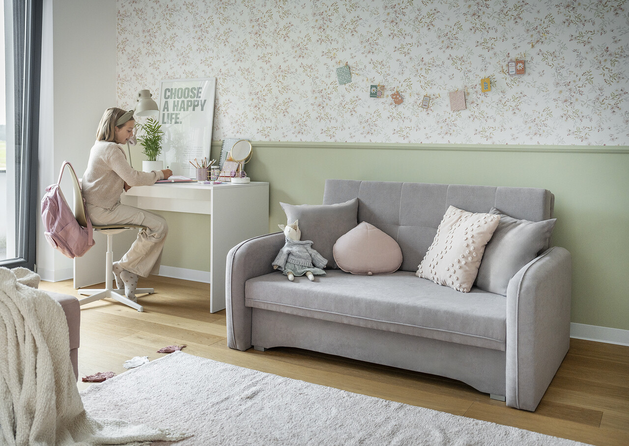Extensibila si functionala, canapeaua Laine se transforma rapid intr-un pat confortabil, fiind perfecta pentru seri de film, oaspeti sau momente de relaxare. Detaliile estetice, precum matlasarea eleganta a spatarului, adauga un plus de rafinament, iar cele doua perne decorative asortate completeaza armonios designul.