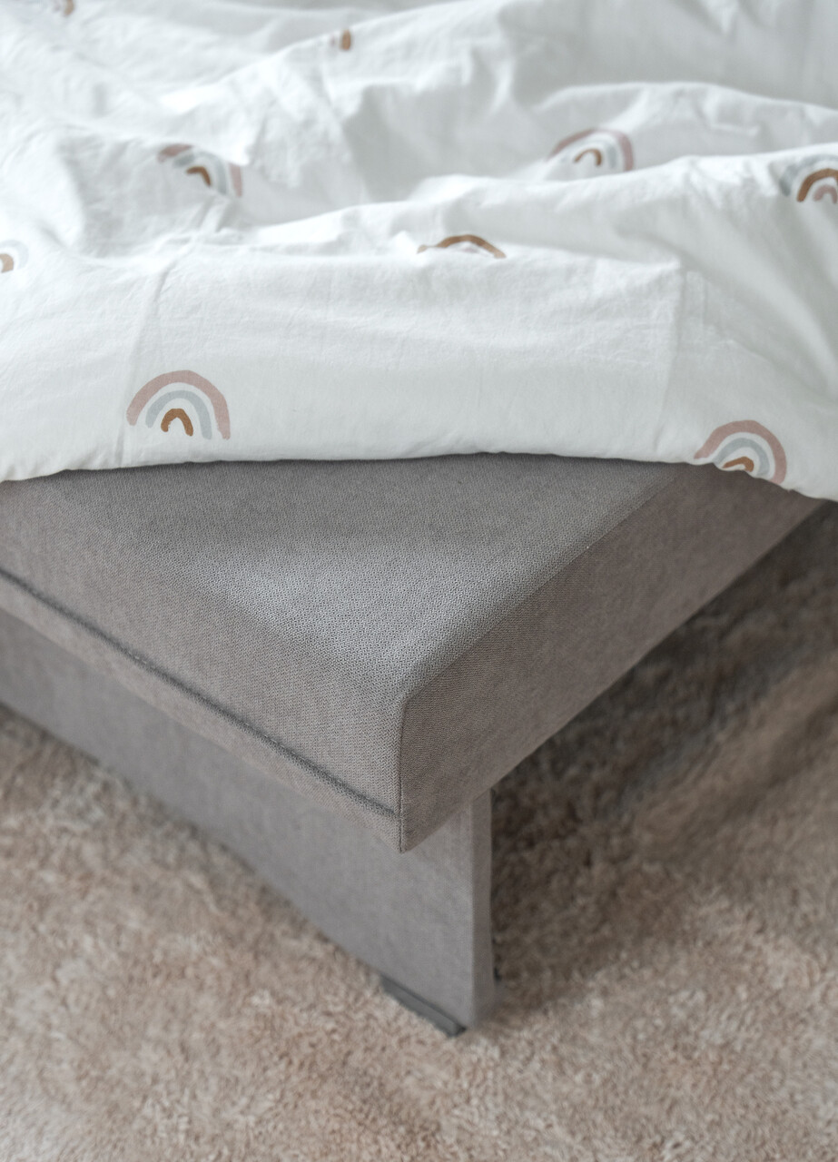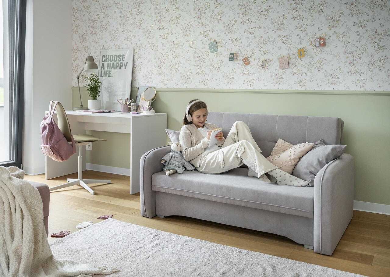 Unul dintre avantajele sale practice este lada de depozitare integrata, ideala pentru pastrarea pernelor, paturilor sau lenjeriei de pat, contribuind la mentinerea ordinii in locuinta. Canapeaua este sustinuta de picioare discrete din plastic, cu o inaltime de doar 3 cm, care ii confera stabilitate fara a incarca vizual spatiul.
