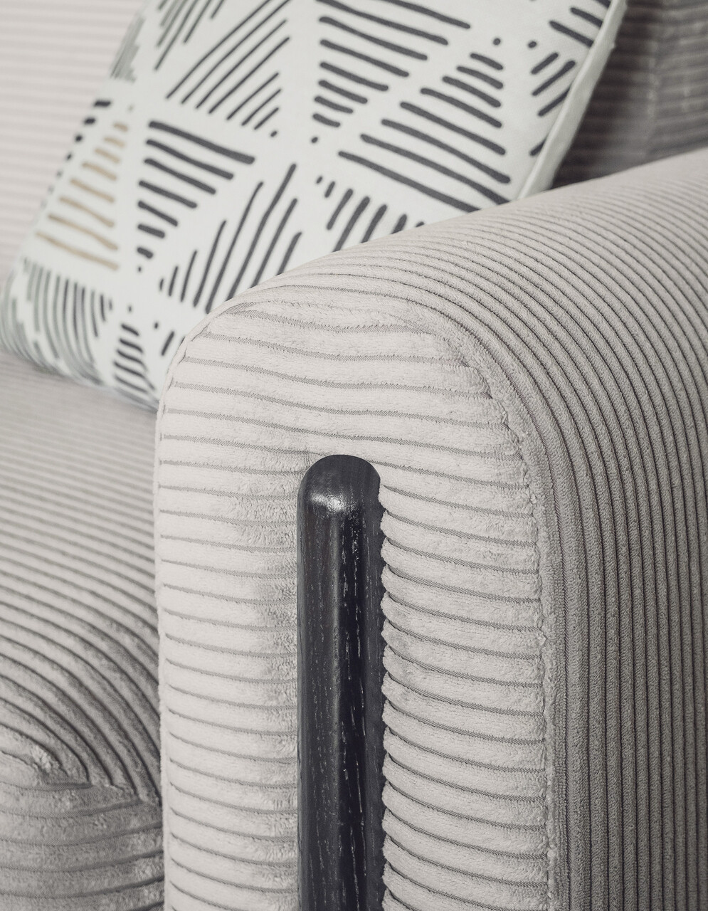 Un detaliu distinctiv al modelului Arcadova il reprezinta cotierele semicirculare care ii accentueaza caracterul sofisticat. Canapeaua este sustinuta de picioare robuste, realizate din lemn masiv de culoare neagra, cu o inaltime de 12 cm, oferindu-i atat stabilitate, cat si un aspect rafinat.