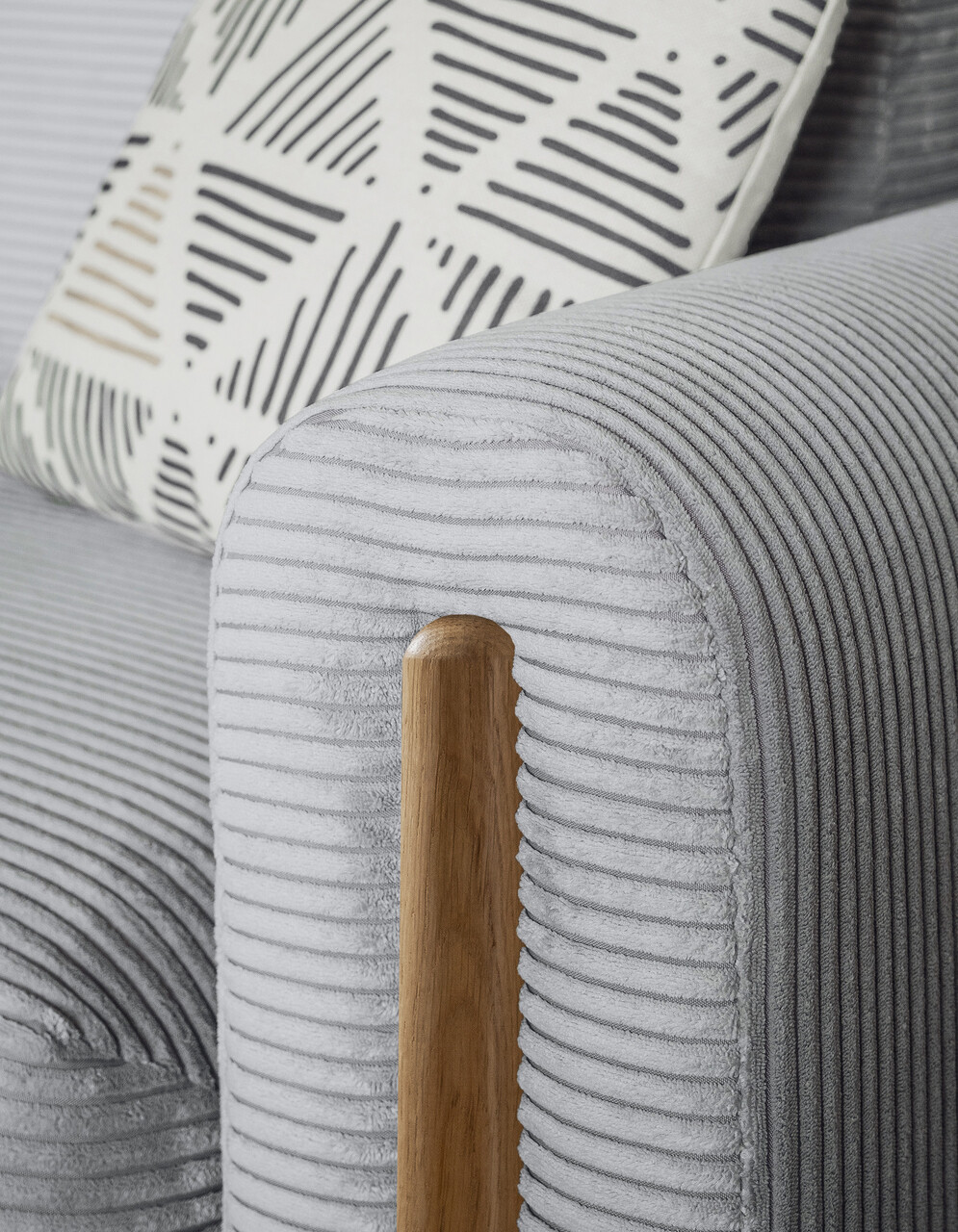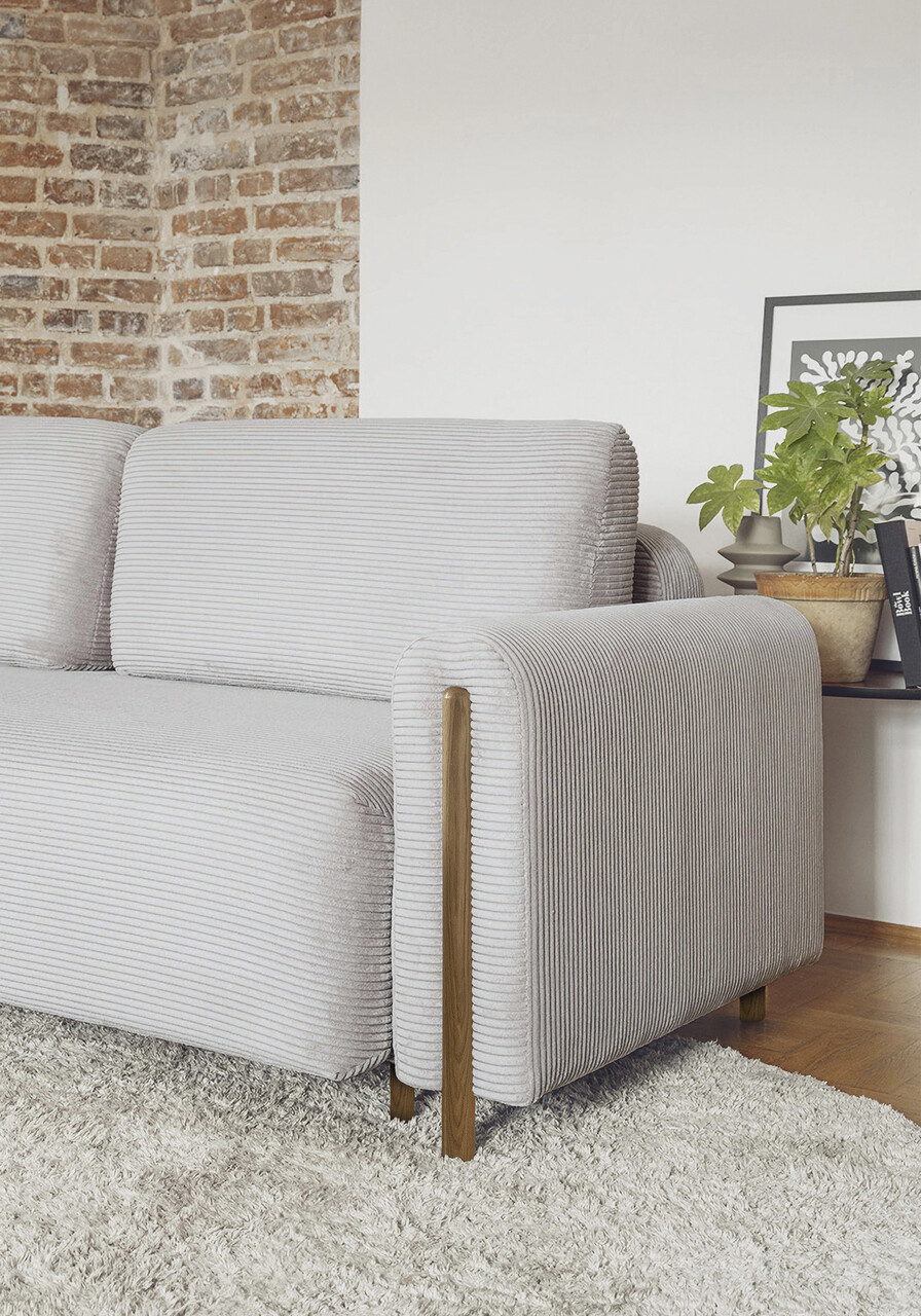 Un detaliu distinctiv al modelului Arcadova il reprezinta cotierele semicirculare care ii accentueaza caracterul sofisticat. Canapeaua este sustinuta de picioare robuste, realizate din lemn masiv de culoarea stejarului, cu o inaltime de 12 cm, oferindu-i atat stabilitate, cat si un aspect rafinat.