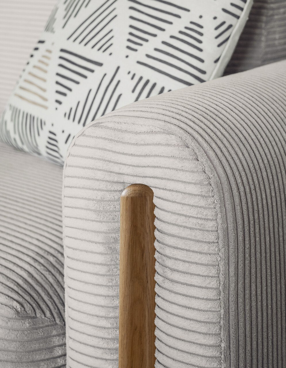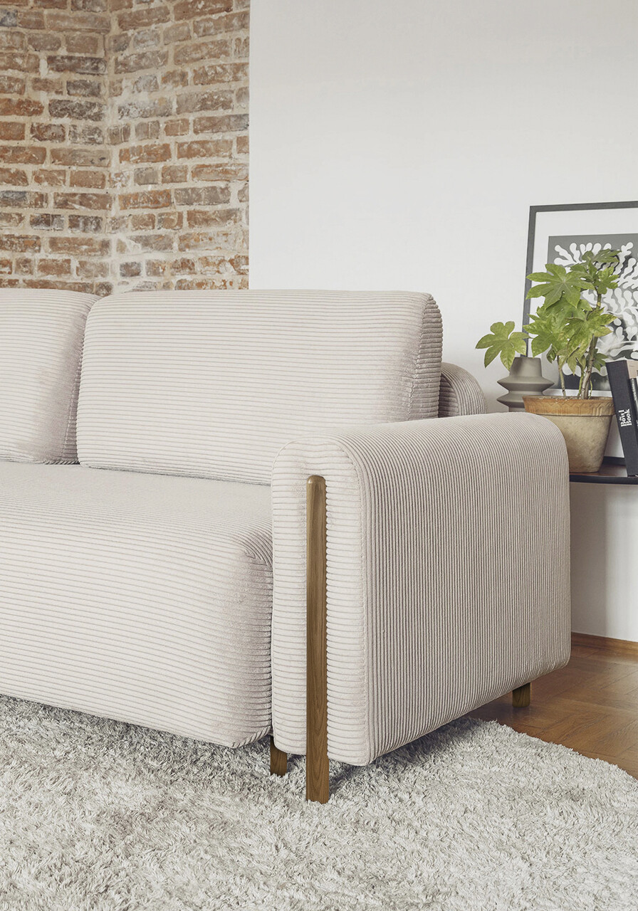 Un detaliu distinctiv al modelului Arcadova il reprezinta cotierele semicirculare care ii accentueaza caracterul sofisticat. Canapeaua este sustinuta de picioare robuste, realizate din lemn masiv de culoarea stejarului, cu o inaltime de 12 cm, oferindu-i atat stabilitate, cat si un aspect rafinat.