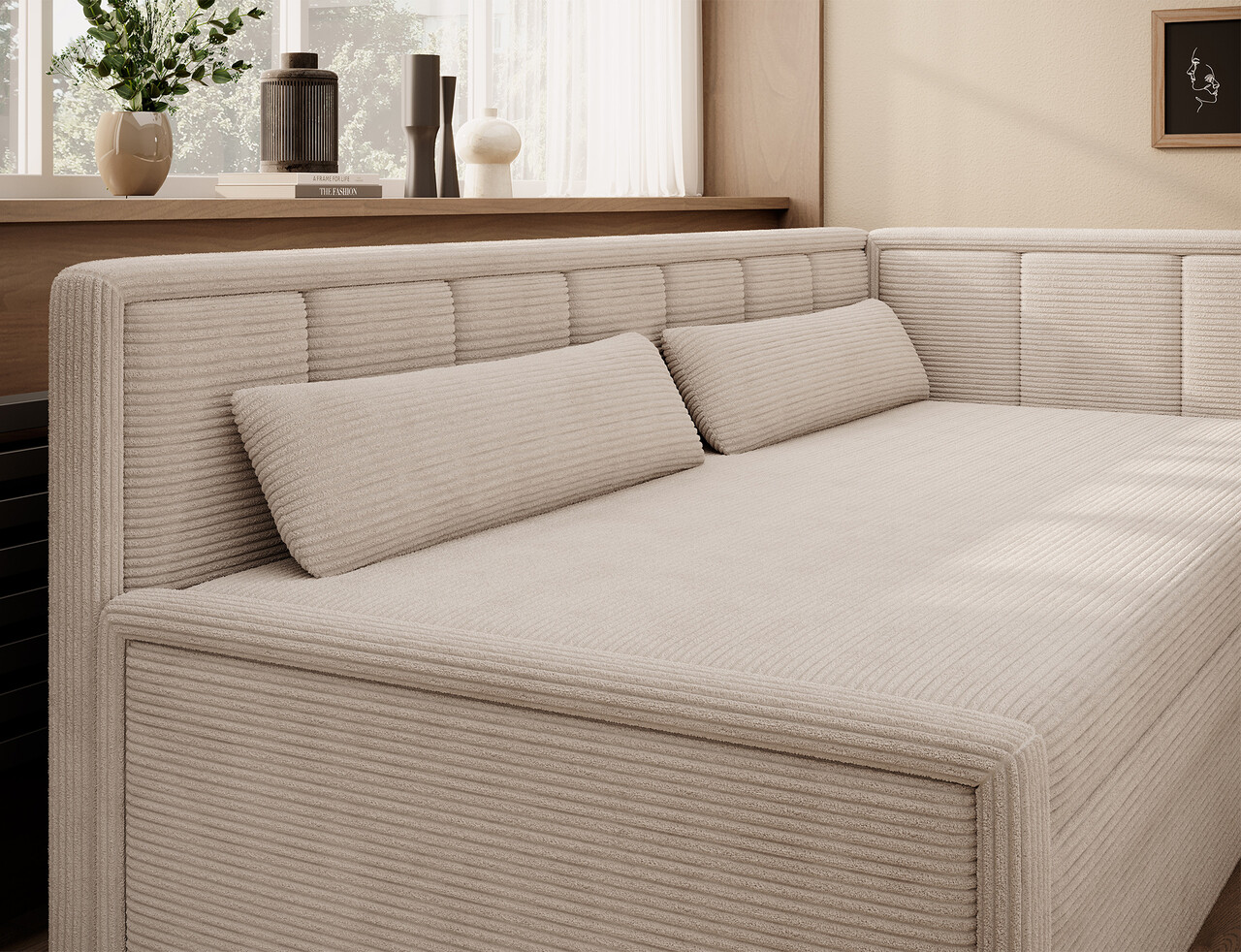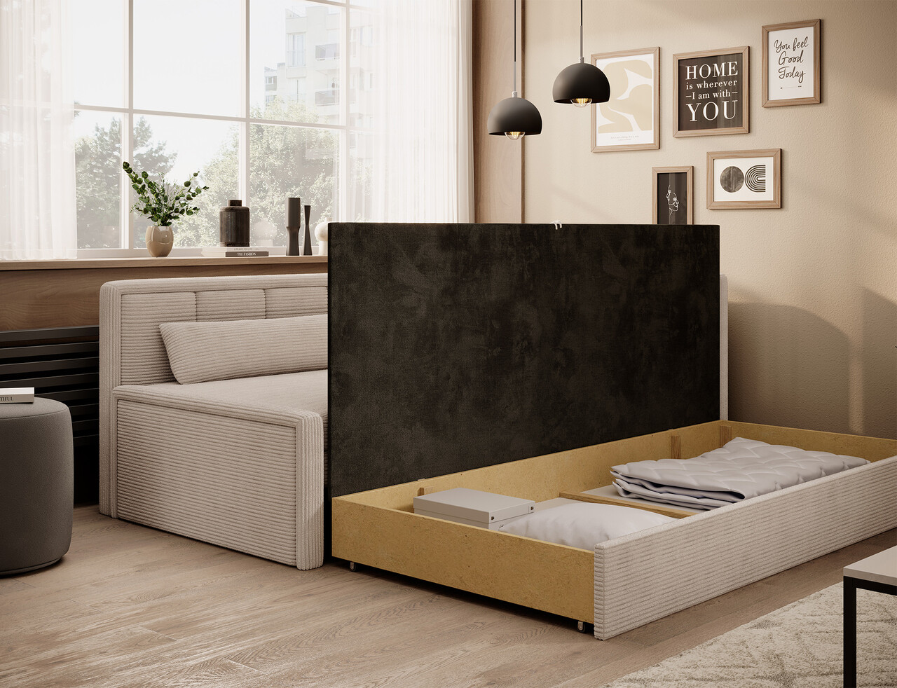 Pentru un confort optim, sezutul este umplut cu spuma poliuretanica T2540 iar spatarul cu spuma T2130, asigurand un suport echilibrat si durabil. Canapeaua dispune de o functie de dormit usor de utilizat si de un compartiment spatios pentru depozitarea asternuturilor, oferind astfel un plus de organizare.
