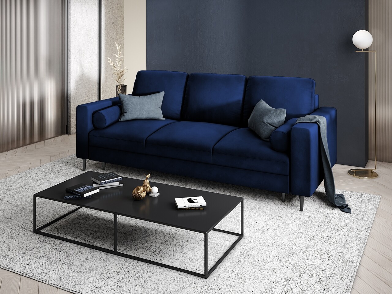 Canapea extensibila, Camellia, Mazzini Sofas, 3 locuri, cu lada de depozitare, 220x100x92 cm, catifea, albastru regal