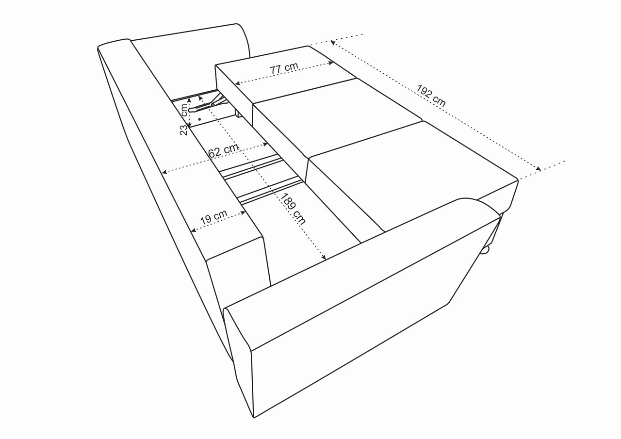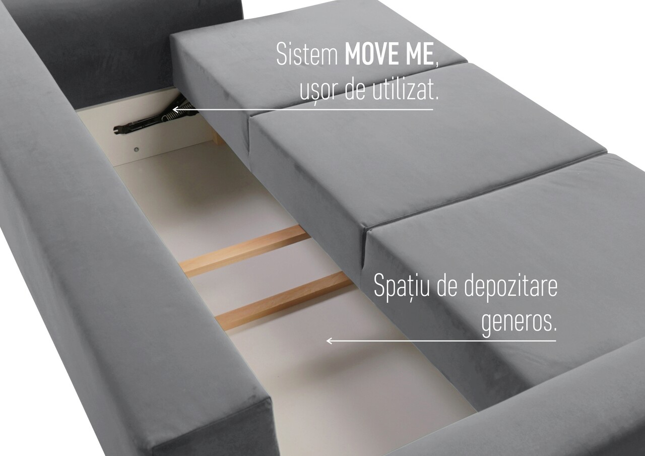 Extensibila, dureaza doar cateva secunde si nu necesita exces de efort pentru a se transforma intr-un pat cu o suprafata generoasa de dormit de 144 x 192 cm. Lada de depozitare reprezinta un avantaj important, fiind spatioasa si usor de accesat.