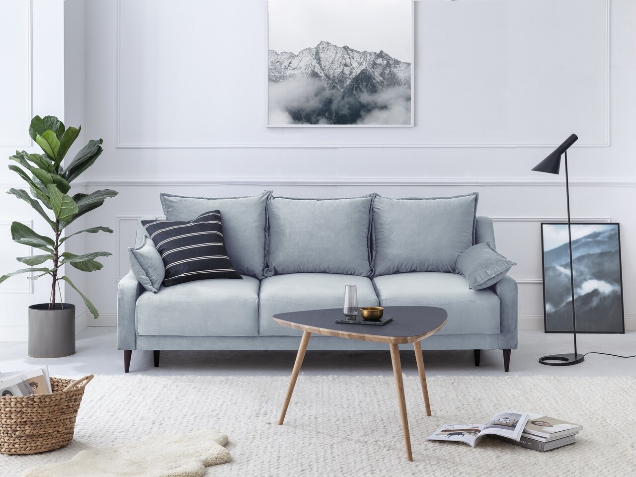 Canapea extensibila, Freesia, Mazzini Sofas, 3 locuri, cu lada de depozitare, 215x94x90 cm, catifea, albastru deschis