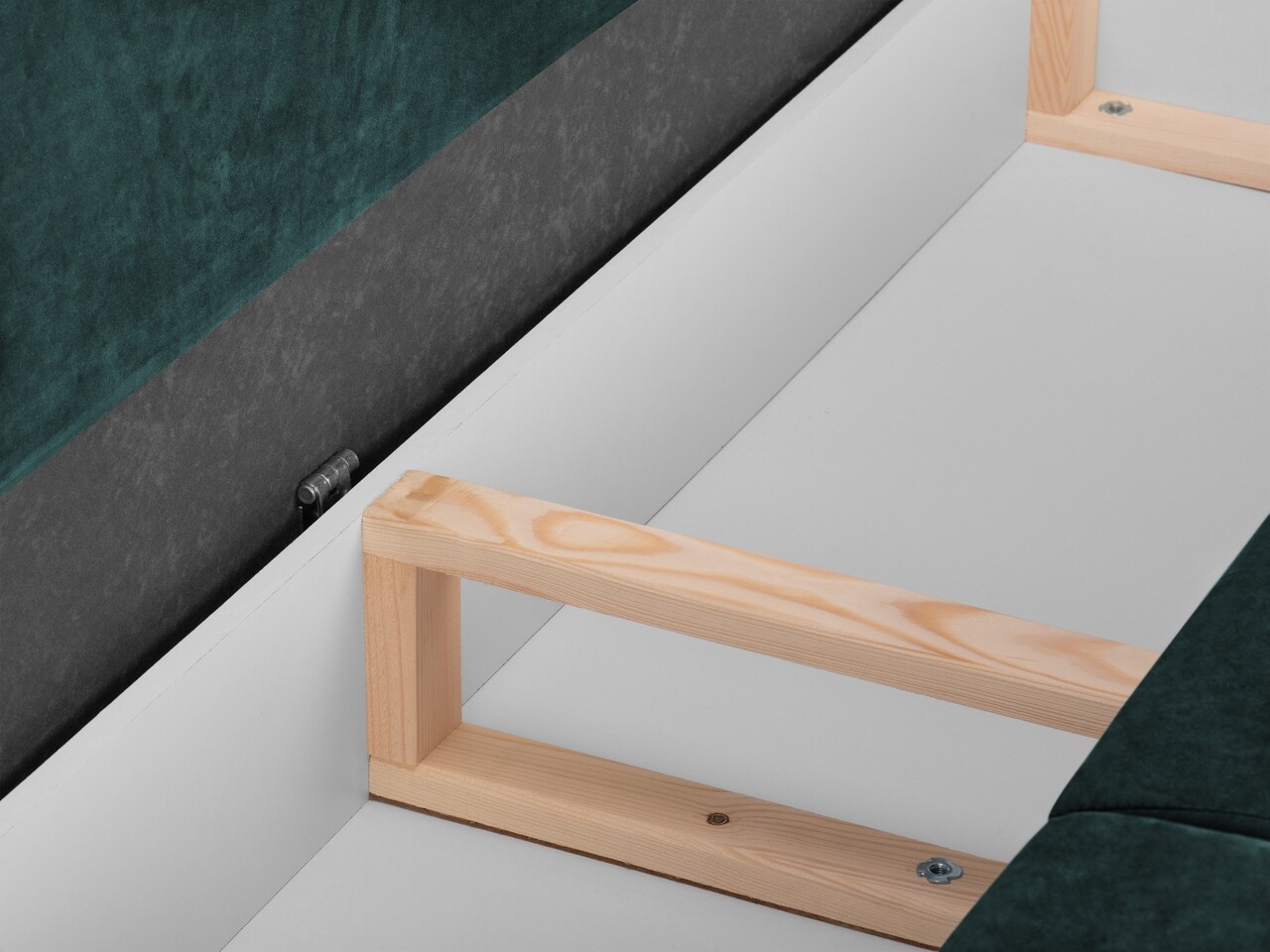 - Material de structura: cadru din lemn masiv de pin, PAL, placi aglomerate de lemn, placaj, arcuri, picioare din lemn de fag vopsit maro inchis