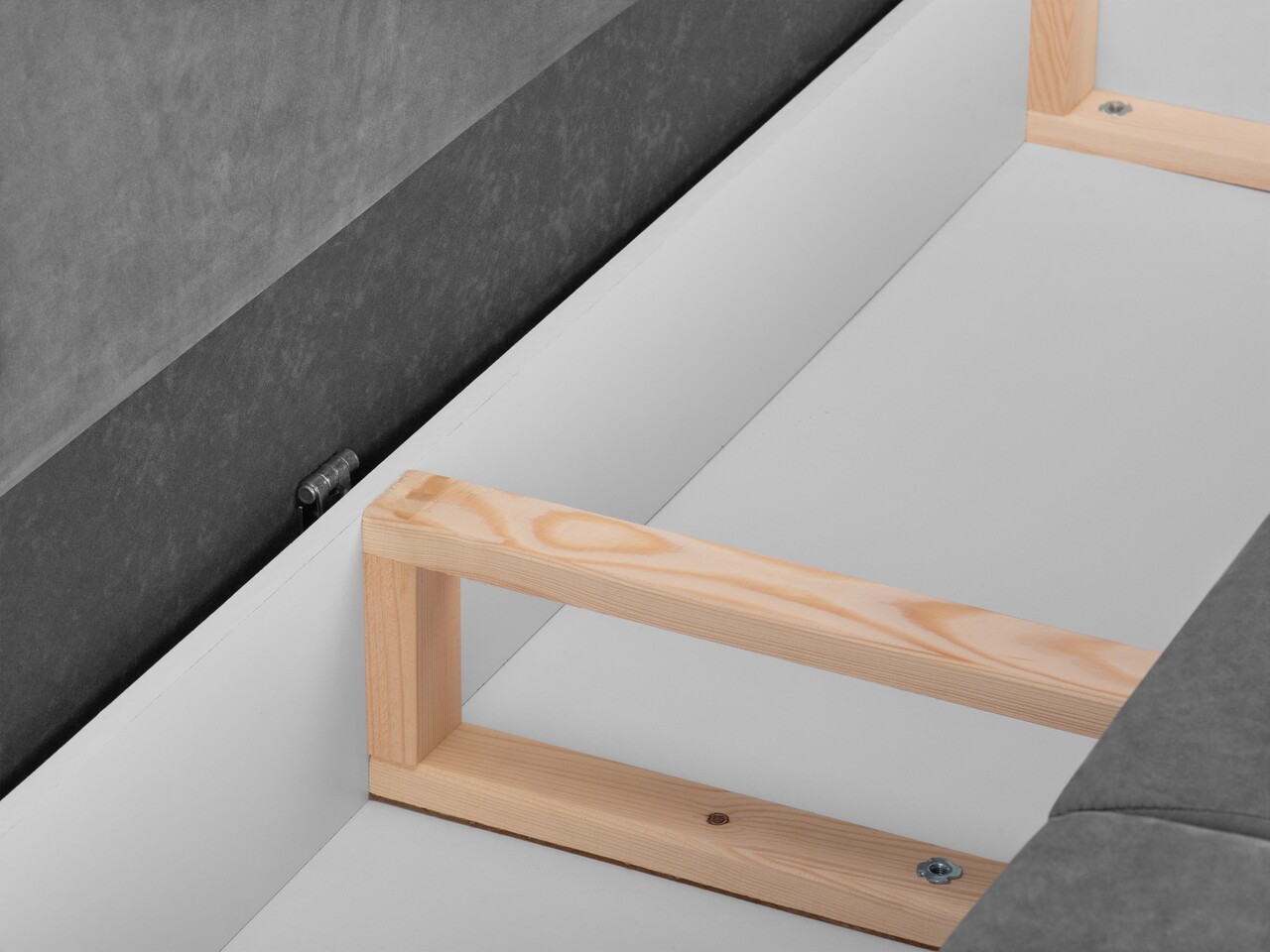 - Material de structura: cadru din lemn masiv de pin, PAL, placi aglomerate de lemn, placaj, arcuri, picioare din lemn de fag vopsit maro inchis