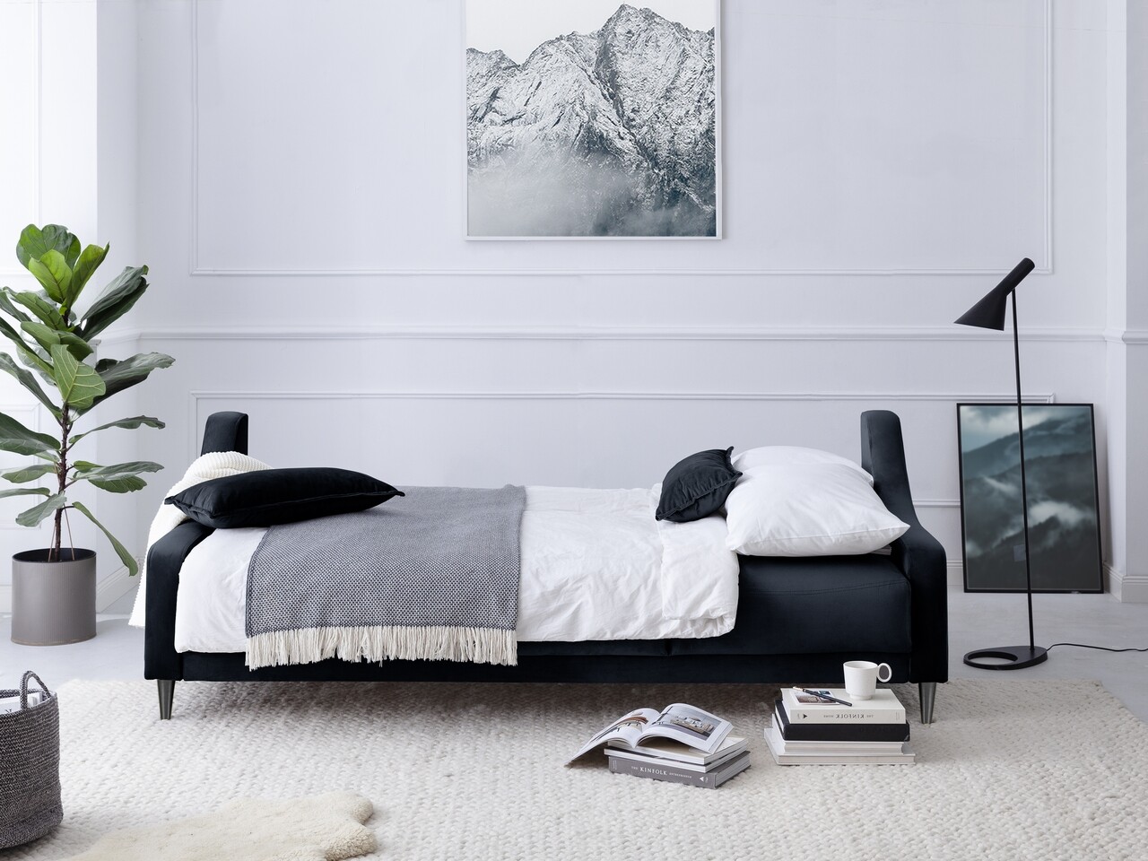 - Material de structura: cadru din lemn masiv de pin, PAL, placi aglomerate de lemn, placaj, arcuri, picioare din metal cromat negru