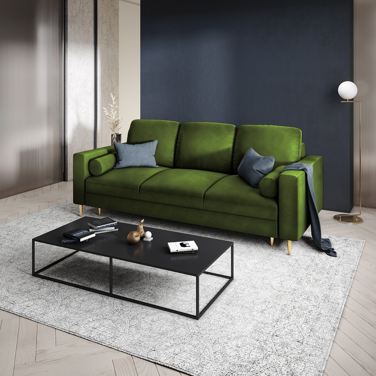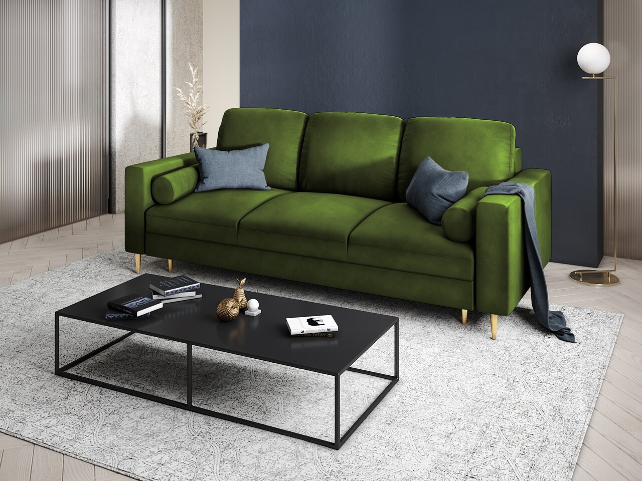 - Material de structura: cadru din lemn masiv de pin, PAL, placi aglomerate de lemn, placaj, arcuri, picioare din metal auriu