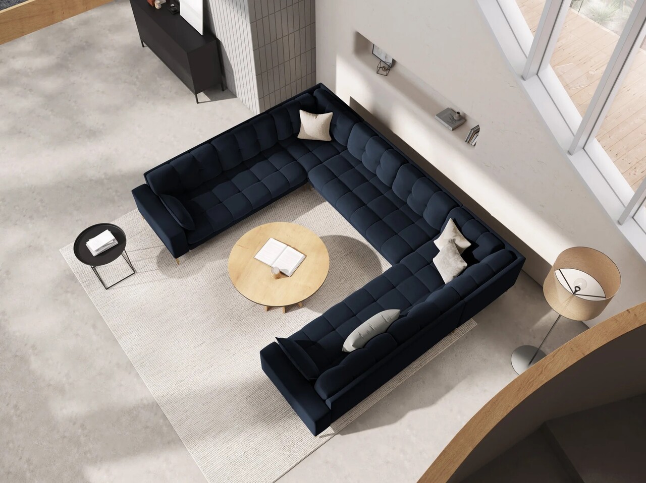 Canapea panoramica 6 locuri, Mamaia, Micadoni Home, GL, 383x185x75 cm, catifea, albastru inchis