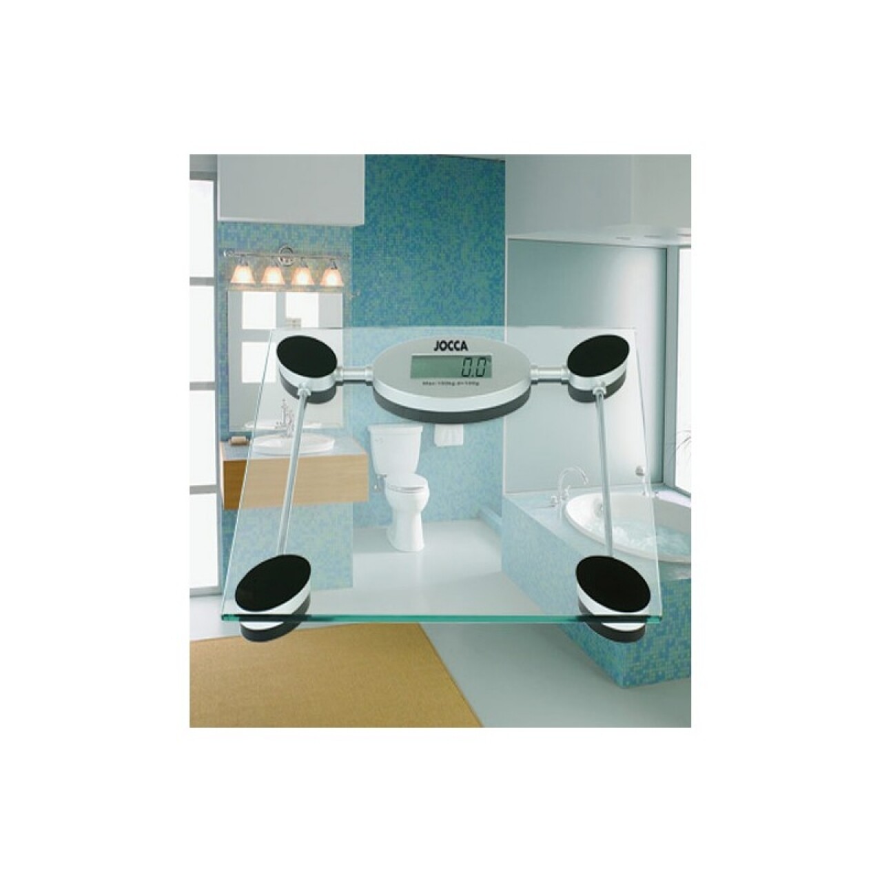 Cântarul Jocca este prevăzut cu picioare antialunecare și afișaj digital. Măsoară greutatea în kg, lb și st.