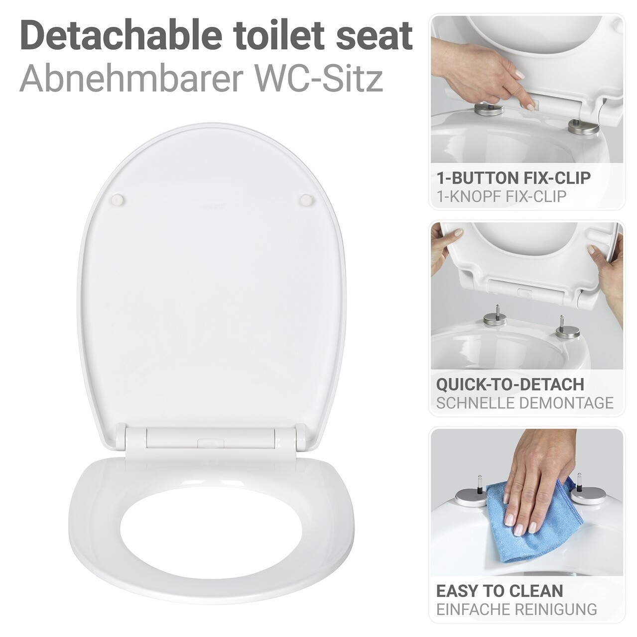 Capacul de toaleta inovator Corbara se caracterizeaza prin prindere usor de utilizat Fix-Clip cu 1 buton care simplifica procesul de instalare si curatare. Acest accesoriu simplu poate fi indepartat si fixat din nou in cel mai scurt timp, economisind o cantitate semnificativa de timp si efort in timpul intretinerii. Datorita insertiei de cauciuc integrate este impiedicat efectiv sa alunece, permitand o utilizare sigura si fiabila. Mecanismul de inchidere moale Easy-Close garanteaza ca se inchide usor si silentios, in timp ce elementele de fixare din otel inoxidabil de inalta calitate ofera robustete si siguranta suplimentara.
