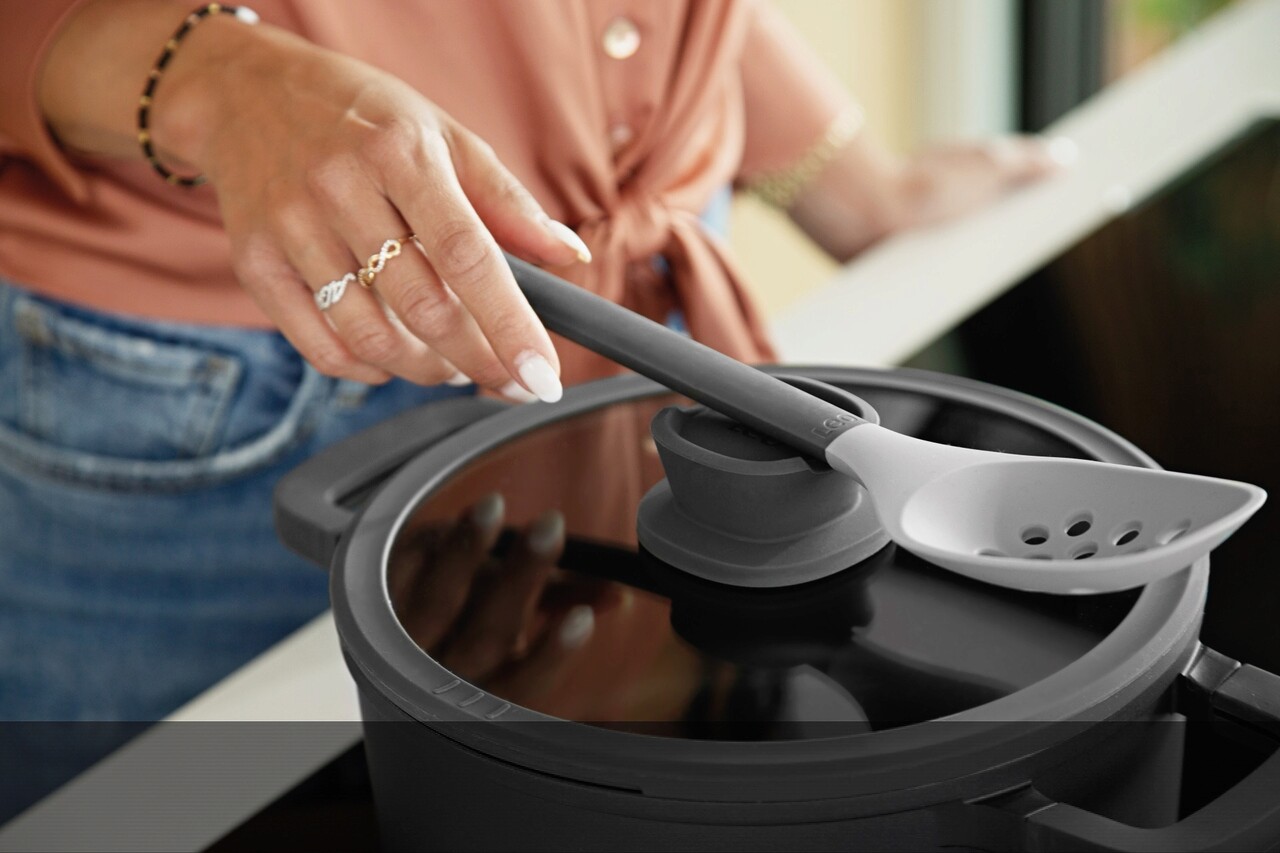 Doriti sa accelerati procesul de incalzire, sa va supravegheati mancarea in timp ce se gateste si sa strecurati cu usurinta ingredientele atunci cand sunt gata? Atunci este timpul sa achizitionati acest capac din sticla transparenta. Se potriveste cu majoritatea oalelor si cratitelor de 20 cm si are o gura de scurgere integrata care serveste si ca orificiu de ventilatie a aburului, asa ca nu trebuie sa va faceti griji nici pentru varsari accidentale. in plus, capacul are o margine din silicon care previne zanganitul si un buton soft-touch care ramane permanent rece si asigura o prindere sigura si confortabila atat atunci cand gatiti, cat si atunci cand duceti capacul de pe aragaz in masina de spalat vase pentru o curatare usoara. Se recomanda spalarea manuala. Dimensiuni interioare 20 x 20 cm. Dimensiuni exterioare 21 x 21 x 5 cm.
