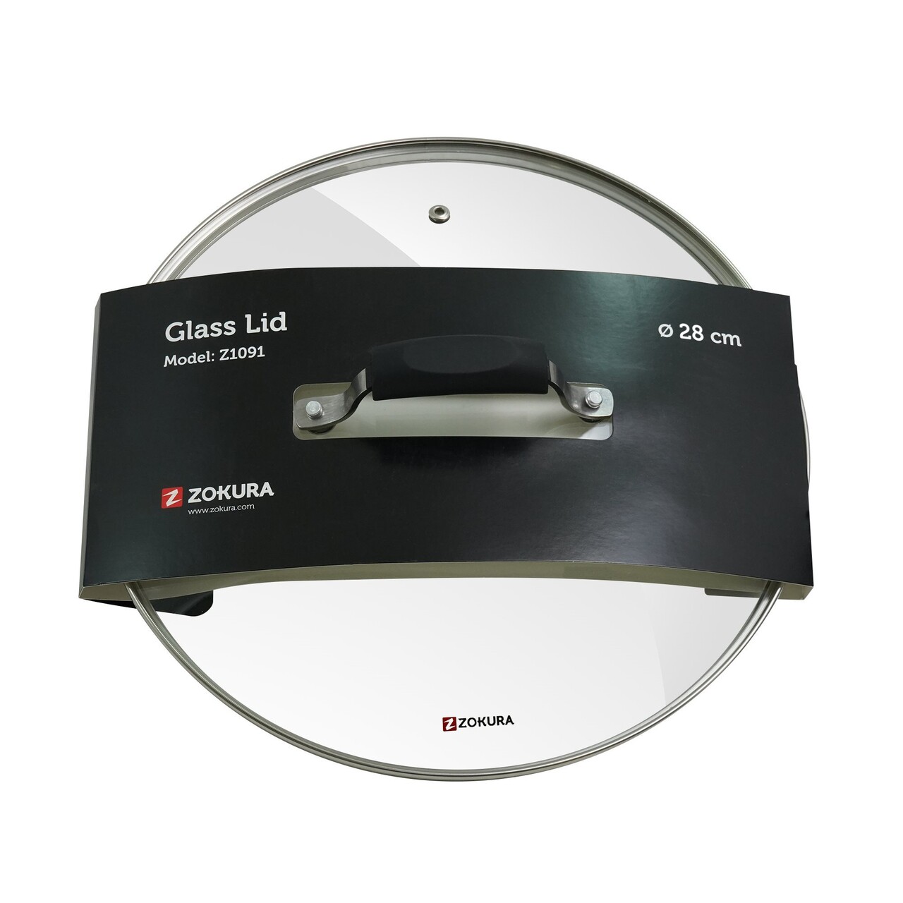 Capac marcaZokura, Fabricat dinSticla, Diametru28 cm, Cu orificiu de aerisire din inox pentru eliberarea aburului.