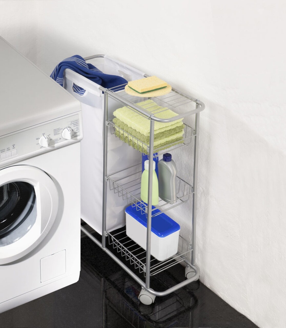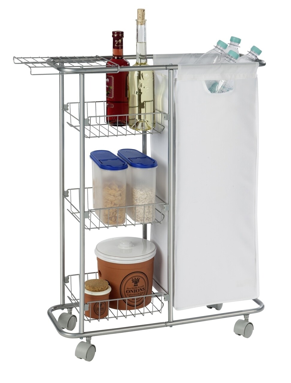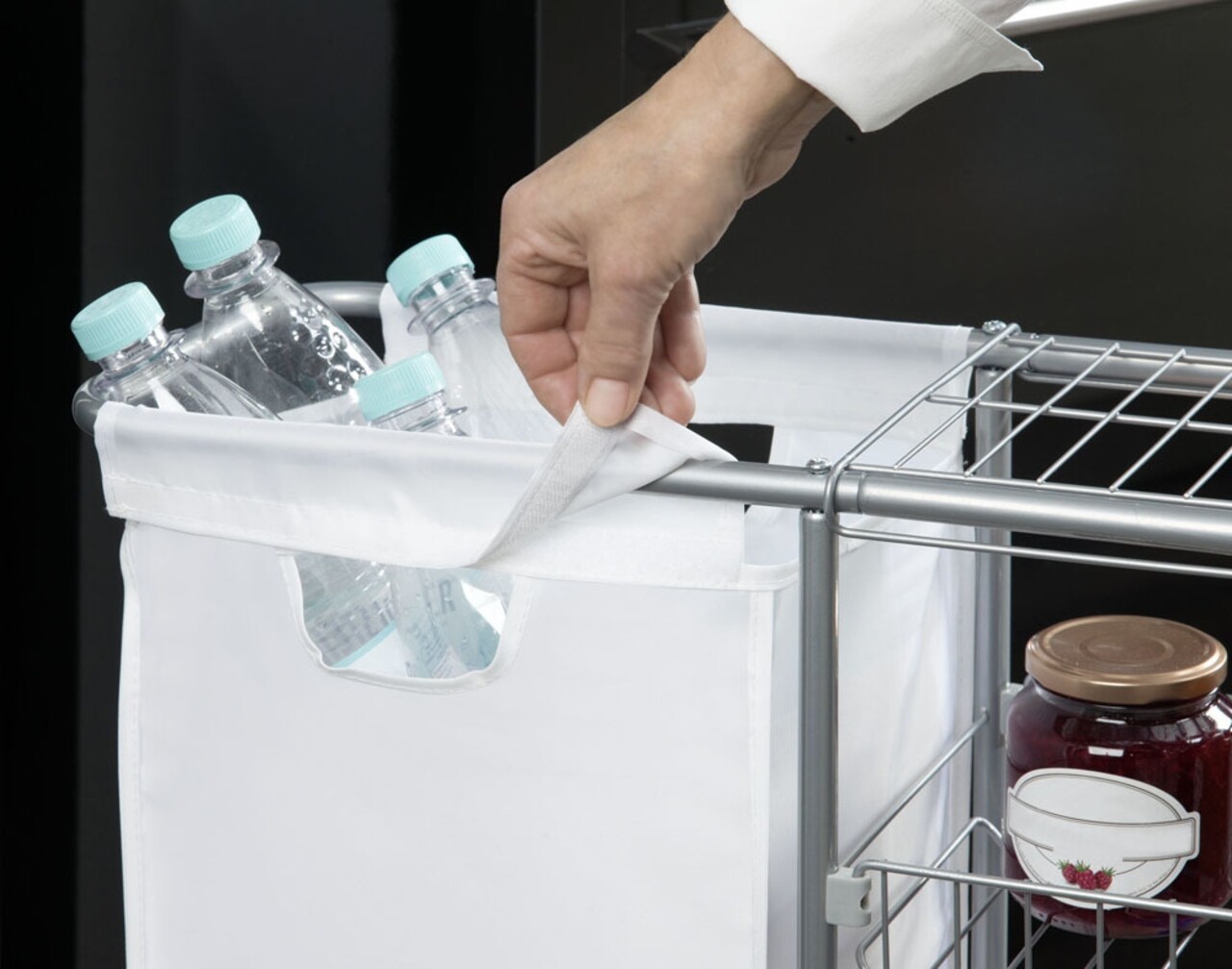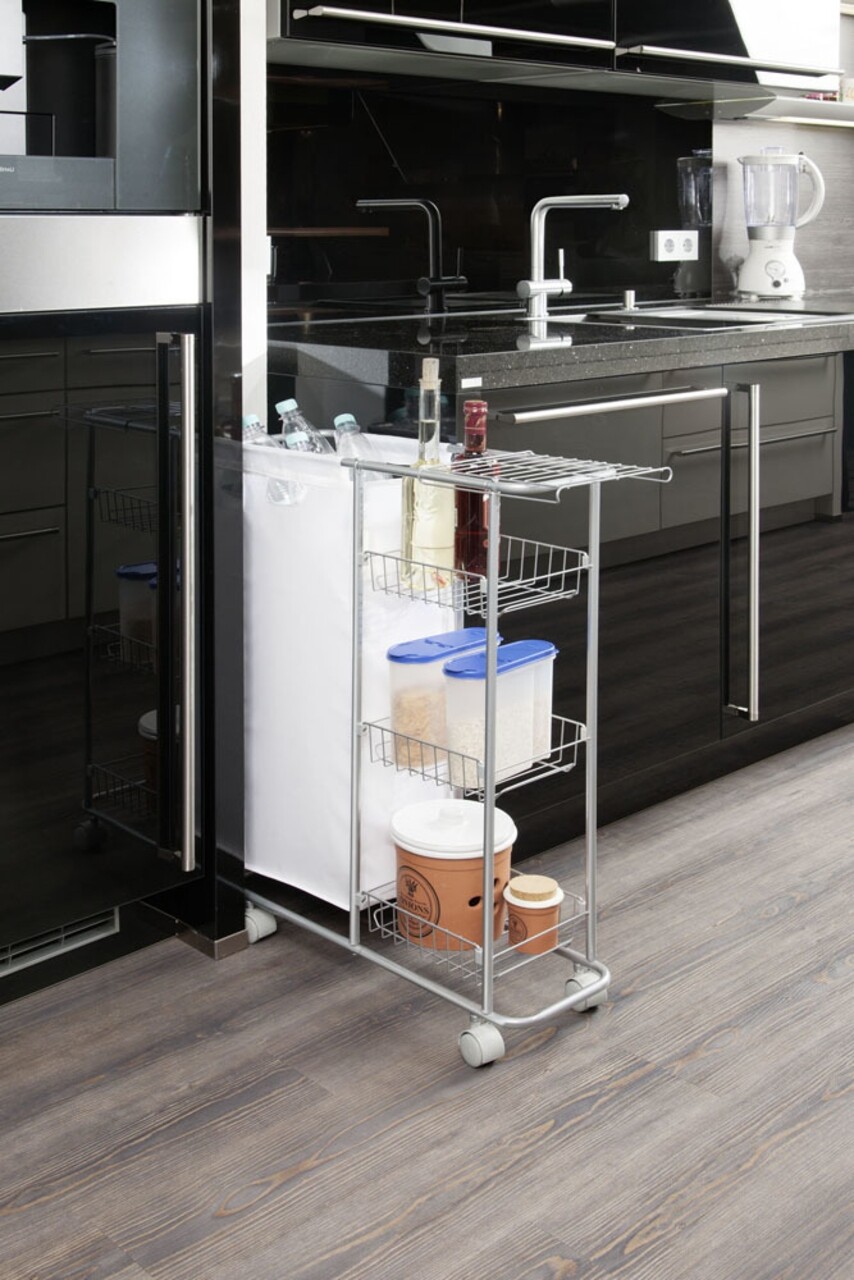 Caruciorul practic de colectare ofera multe functii practice pentru bucatarie si restul gospodariei. Mancarea si ustensilele pot fi asezate pe cele 3 rafturi de depozitare. Datorita raftului extensibil, chiar si sticlele lungi precum sticlele de otet si ulei pot fi depozitate pe partea de sus. In sacul detasabil cu o capacitate de 28 de litri, sticlele pot fi colectate si transportate cu usurinta catre punctul de reciclare. Caruciorul se potriveste perfect sub blatul de bucatarie si poate fi extras cu usurinta datorita celor 4 roti. Caruciorul se potriveste, de asemenea, in spatii mici datorita formei sale extra-subtiri. Sacul poate fi utilizat drept cos de rufe, iar rafturile spatioase pot gazdui detergenti si alte accesorii de spalat.
