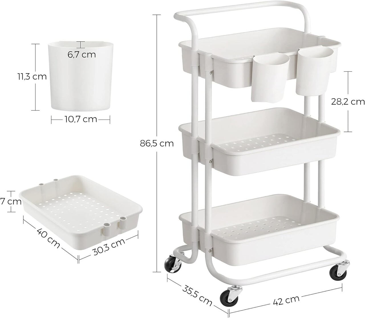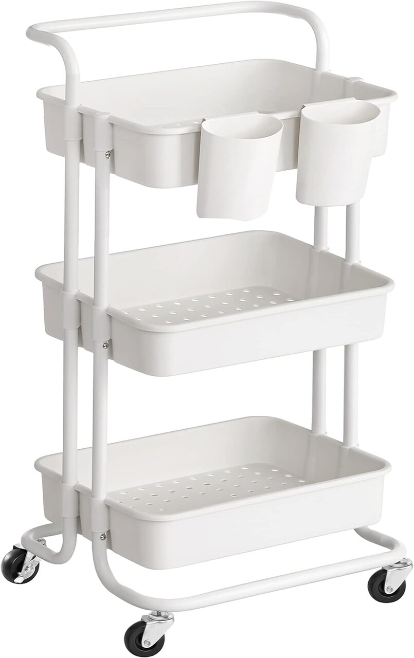 Carucior cu 3 rafturi bucatarie/baie, Songmics, 41.6x33.5x86.3 cm, max 10kg/nivel, otel/plastic, alb