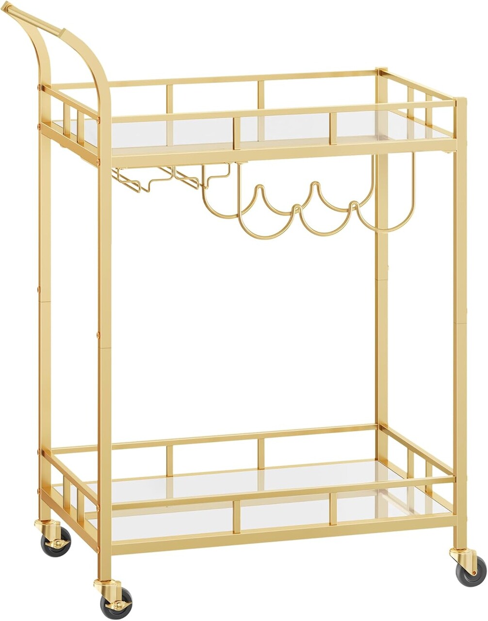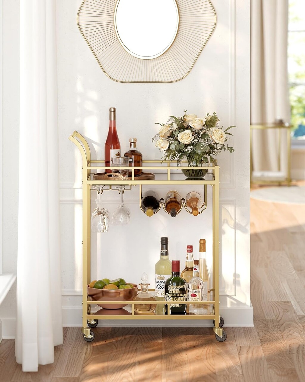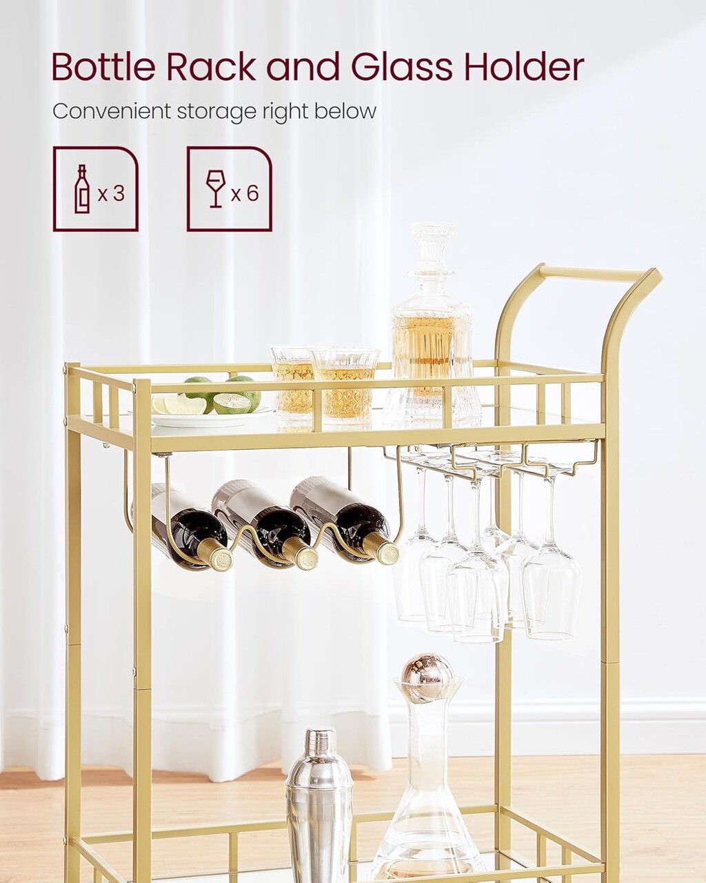 O declaratie de stil Un cadru auriu la moda, rafturi cu oglinzi, maner curbat elegant... acest carucior de servire confera o nota de lux spatiului tau, fie ca este vorba de zona de bar, sufragerie sau bucatarie.
