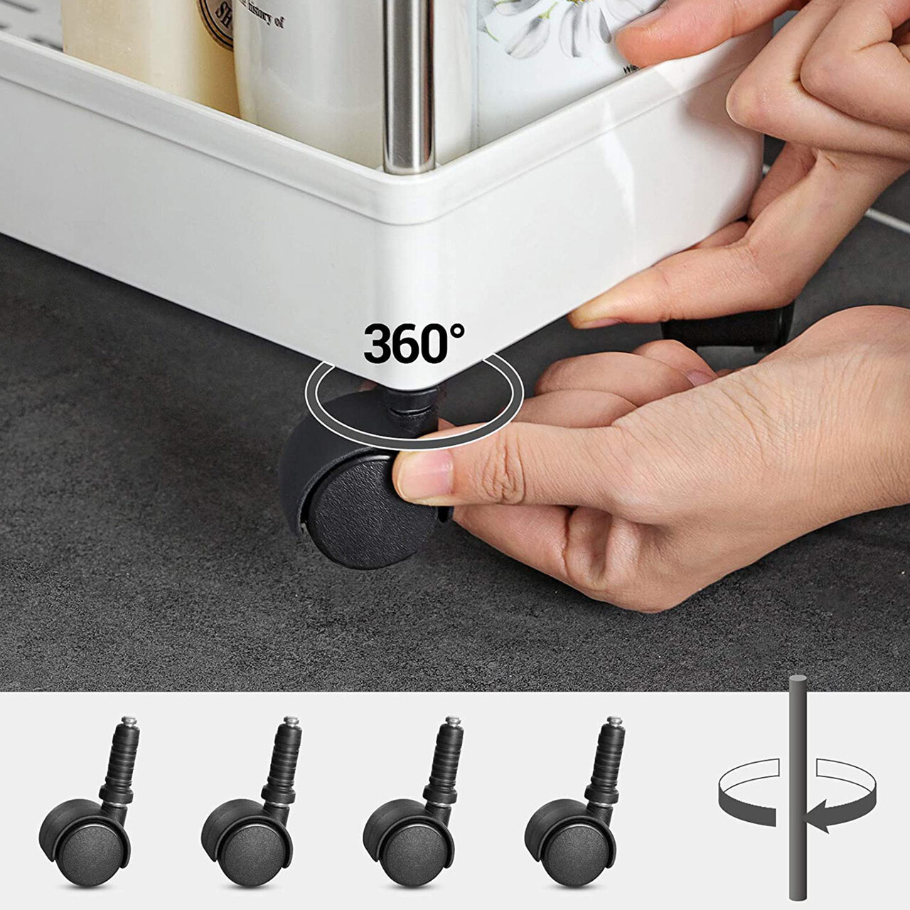 Datorita celor 4 roti pivotante, caruciorul se deplaseaza rapid si fara efort oriunde ai nevoie. Este ideal pentru sticle, borcane, produse cosmetice sau accesorii pentru gatit.