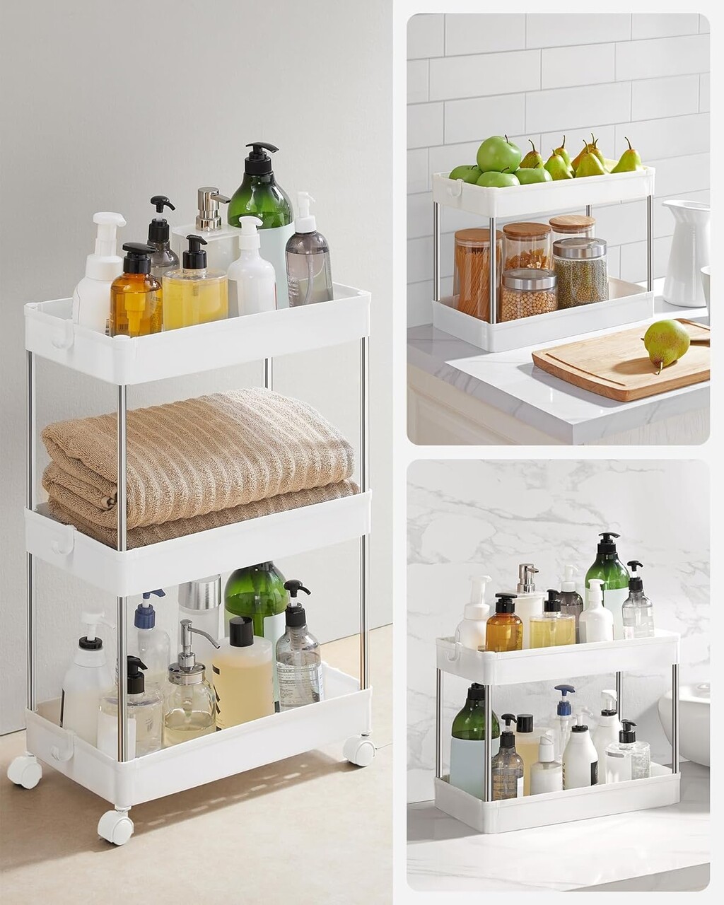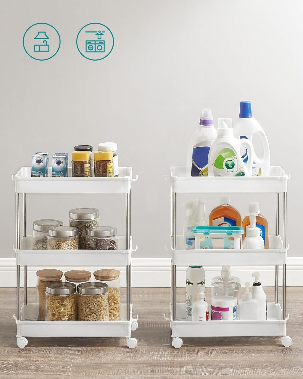 Acest carucior de depozitare compact, cu dimensiuni de 42 x 22.5 x 61 cm, este perfect pentru bucatarii, bai, dormitoare sau spalatorii. Se potriveste in colturi sau intre electrocasnice, ajutandu-te sa economisesti spatiu si sa pastrezi totul organizat.