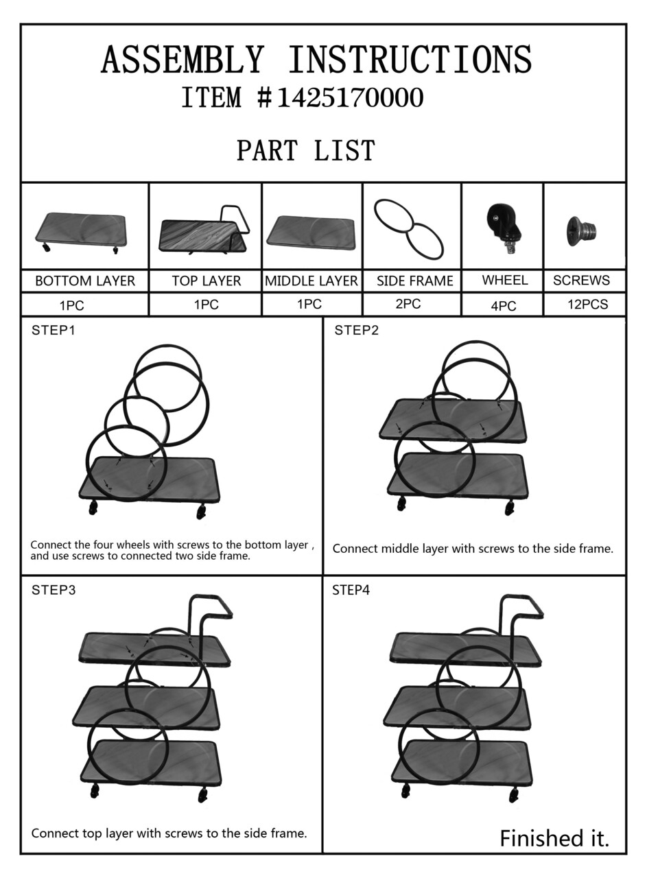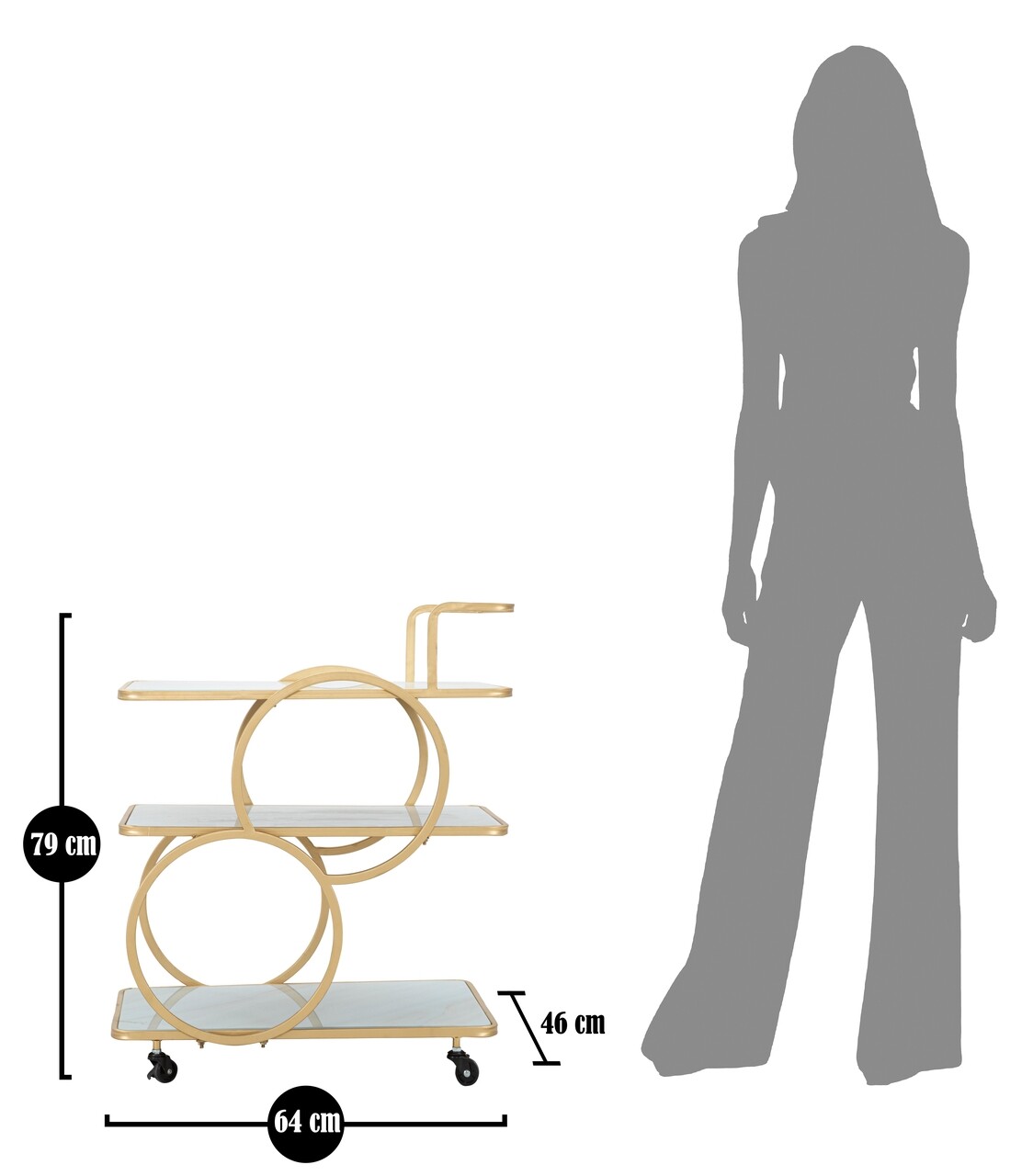 Carucior pentru alimente cu structura din metal auriu cu 3 rafturi din sticla realizate cu prelucrare asemanatoare marmurei. Designul geometric format din 2 cercuri si contrastul de culori confera o nota de eleganta.