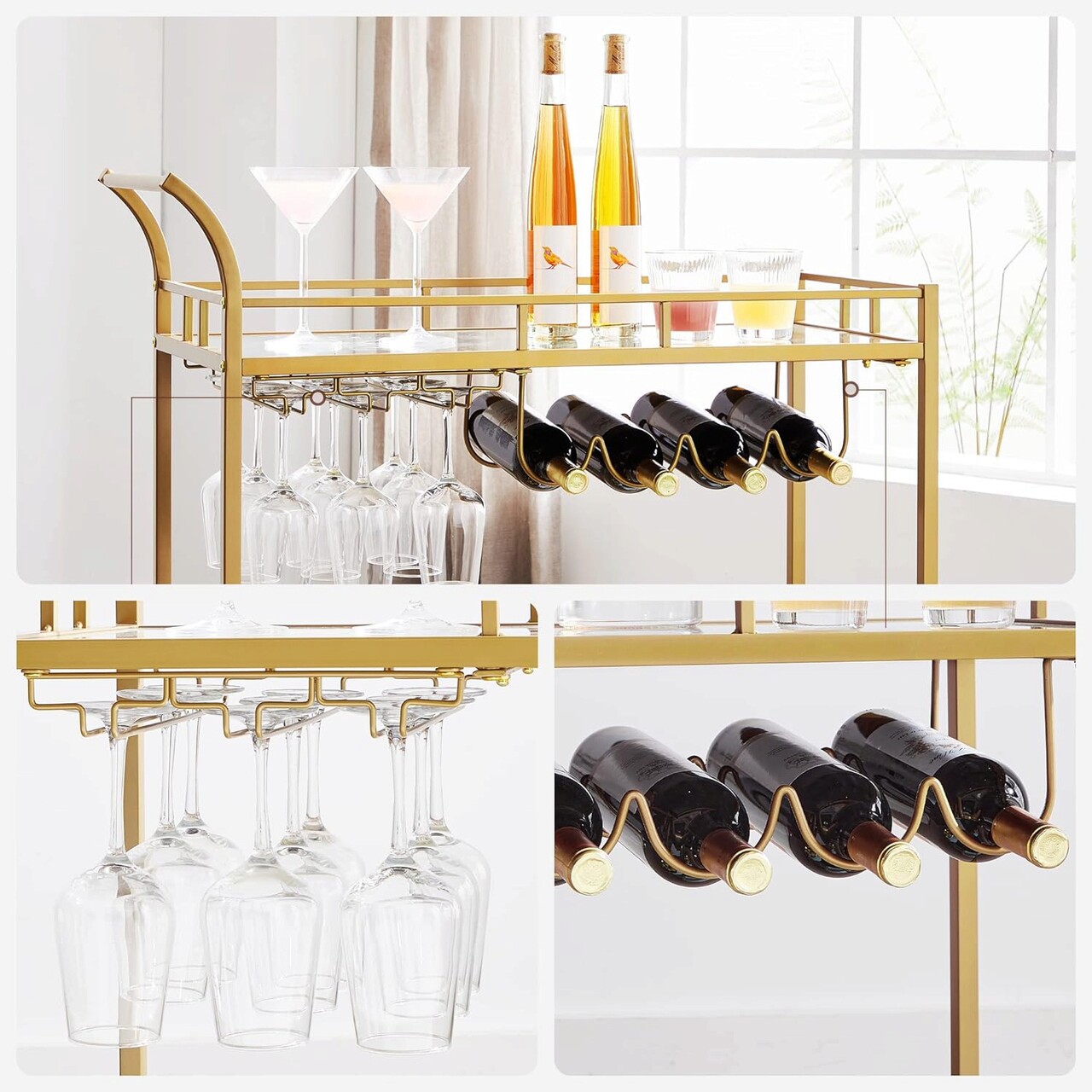 Cu un cadru auriu sic, rafturi din sticla cu oglinda, maner elegant curbat, acest carucior va adauga o nota luxurianta zonei de bar, sufrageriei, bucatariei sau altor spatii.