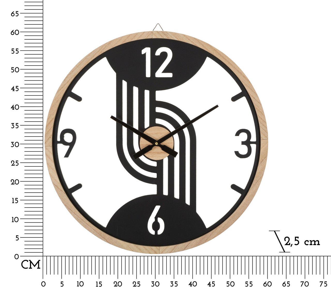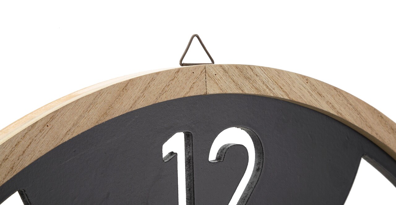 Ceas de perete rotund din metal si lemn compus din linii rotunjite si regulate. Functioneaza cu baterie AA neinclusa.