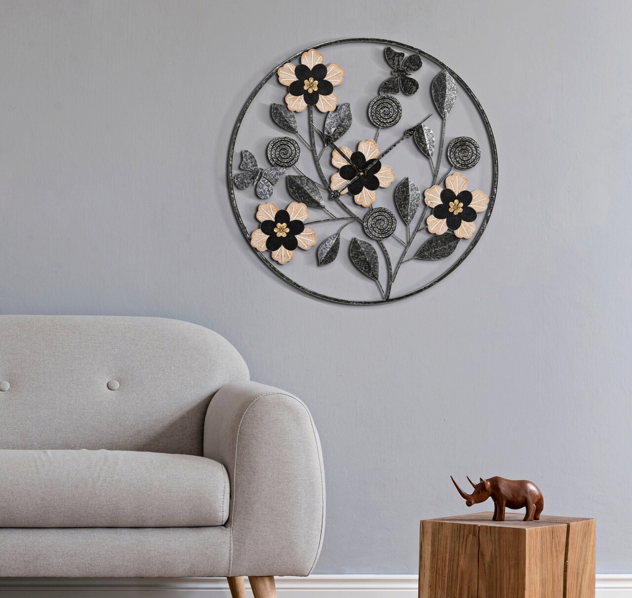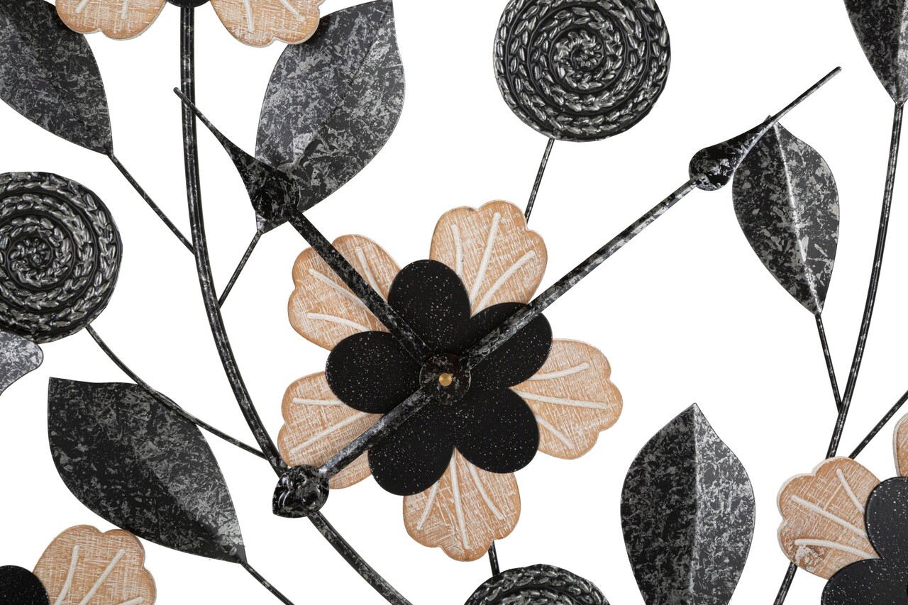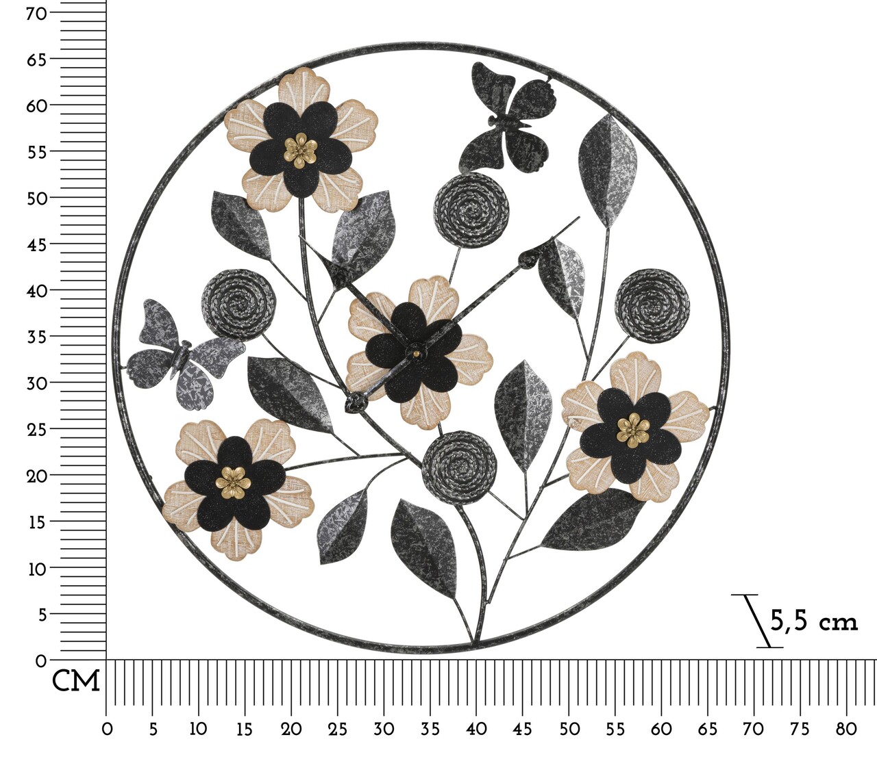 Ceas de perete rotund cu un cadran decorat elegant cu flori, frunze si fluturi.